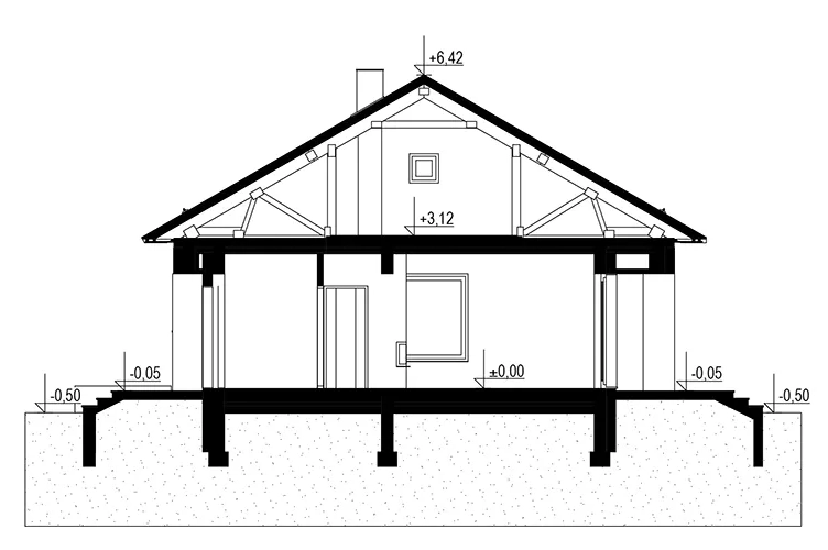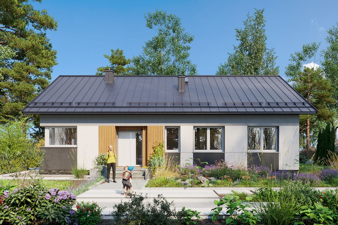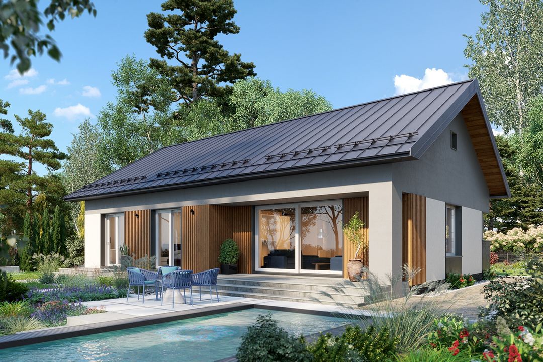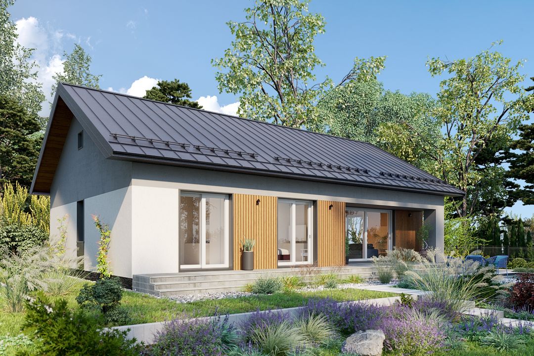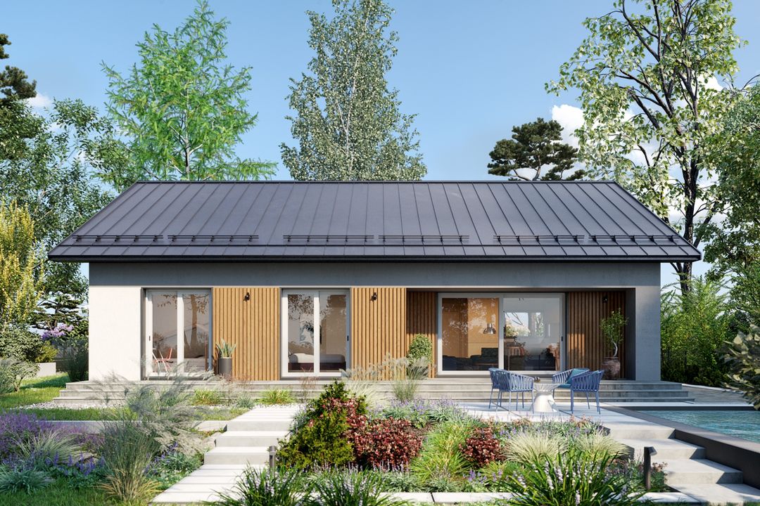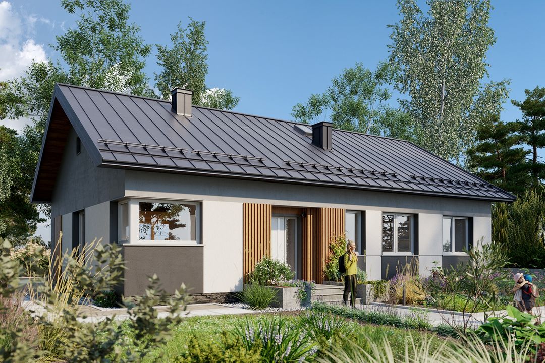 Wersja technologiczna: murowana - beton komórkowy. Izolacja termiczna ścian zewnętrznych: Termo Organika TERMONIUM FASADA / alternatywnie Gór-Stal płyta izolacyjna termPIR ETX. Strop: dolny pas wiązarów MITEK. Typ schodów: brak. Konstrukcja dachu: prefabrykowane wiązary drewniane MITEK Industries Polska. Pokrycie dachowe: Zintegrowany system - dachowo rynnowy DACHRYNNA z panelem na rąbek modułowy GRIN MOD. Typ ogrzewania: Kocioł na gaz. Dostępna wersja z pompą ciepła: Tak. Dostępna wersja z fotowoltaiką: Tak. Wentylacja: mechaniczna. Ściany zewnętrzne: 24 cm beton komórkowy Solbet Optimal. Ściany wewnętrzne: 24 cm beton komórkowy Solbet Optimal. Ściany wewnętrzne działowe: 12 cm beton komórkowy Solbet One. Wentylacja: mechaniczna Heatpex Aria.