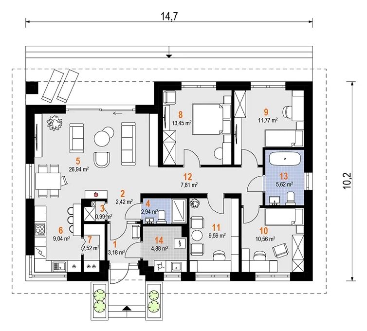 Graficzne opracowanie rzutów poglądowych widocznych na karcie projektu zostało wykonane przez Extradom.pl. Prezentowane przez Extradom.pl wizualizacje wykonane zostały przez autora projektu i należy poczytywać je jedynie za przykład i propozycję wykończenia, wizję architektoniczną autora projektu. Ostateczne wykończenie budynku może nastąpić na wiele sposobów. Szczegółowe rozwiązania zastosowane w oferowanej dokumentacji - w tym również ilość, lokalizacje i wygląd okien, drzwi, kominów - mogą w niewielkim stopniu różnić się od prezentowanej wizualizacji budynku.