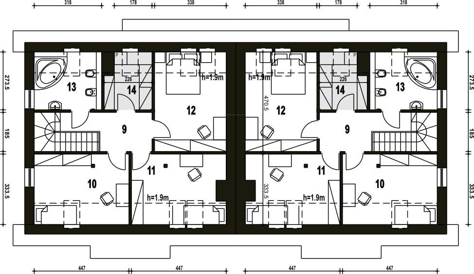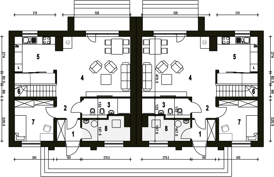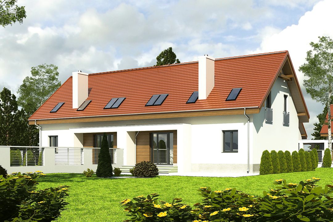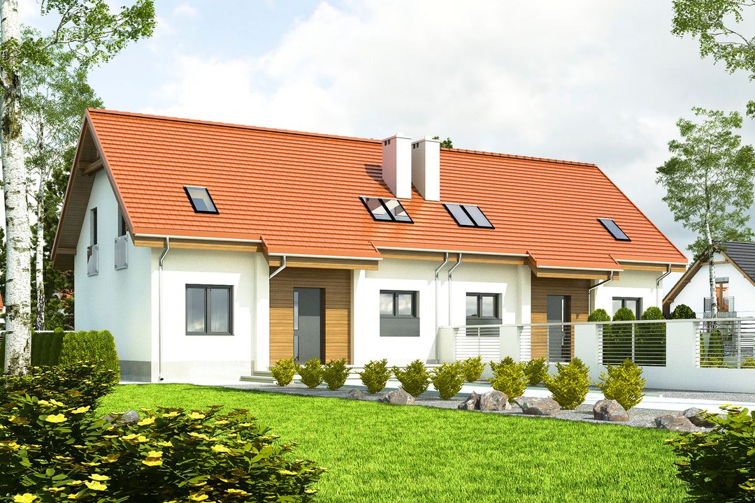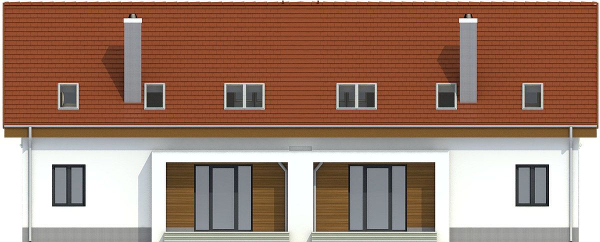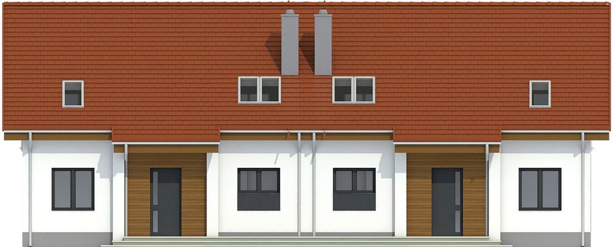 Projekt wymaga aktualizacji. Przy zakupie projektu należy zapłacić 50% zaliczki. Zaliczka jest bezzwrotna w przypadku zwrotu lub rezygnacji z zamówienia. Budynek dwulokalowy posadowiony na wspólnym fundamencie. Jeśli planujesz budowę na osobnych działkach zamów pojedyncze segmenty: podstawa + lustro.