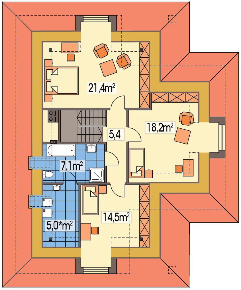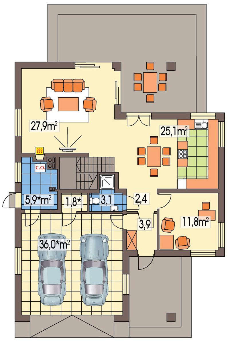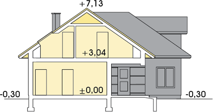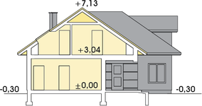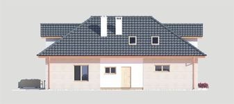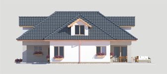 Graficzne opracowanie rzutów poglądowych widocznych na karcie projektu zostało wykonane przez Extradom.pl. Prezentowane przez Extradom.pl wizualizacje wykonane zostały przez autora projektu i należy poczytywać je jedynie za przykład i propozycję wykończenia, wizję architektoniczną autora projektu. Ostateczne wykończenie budynku może nastąpić na wiele sposobów. Szczegółowe rozwiązania zastosowane w oferowanej dokumentacji - w tym również ilość, lokalizacje i wygląd okien, drzwi, kominów - mogą w niewielkim stopniu różnić się od prezentowanej wizualizacji budynku.