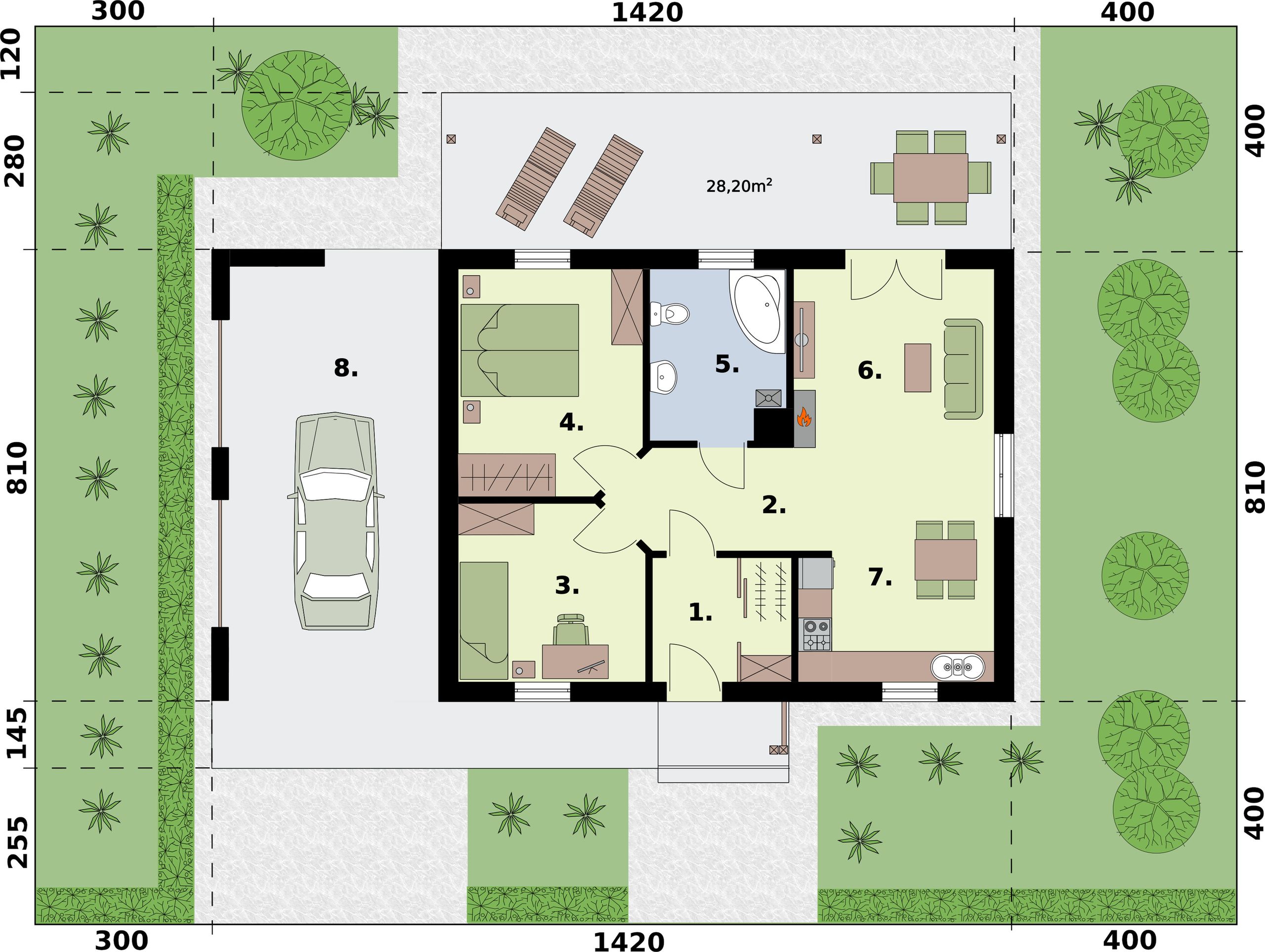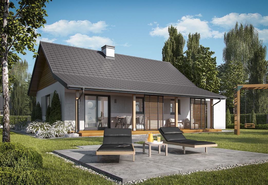 Graficzne opracowanie rzutów poglądowych widocznych na karcie projektu zostało wykonane przez Extradom.pl. Prezentowane przez Extradom.pl wizualizacje wykonane zostały przez autora projektu i należy poczytywać je jedynie za przykład i propozycję wykończenia, wizję architektoniczną autora projektu. Ostateczne wykończenie budynku może nastąpić na wiele sposobów. Szczegółowe rozwiązania zastosowane w oferowanej dokumentacji - w tym również ilość, lokalizacje i wygląd okien, drzwi, kominów - mogą w niewielkim stopniu różnić się od prezentowanej wizualizacji budynku.