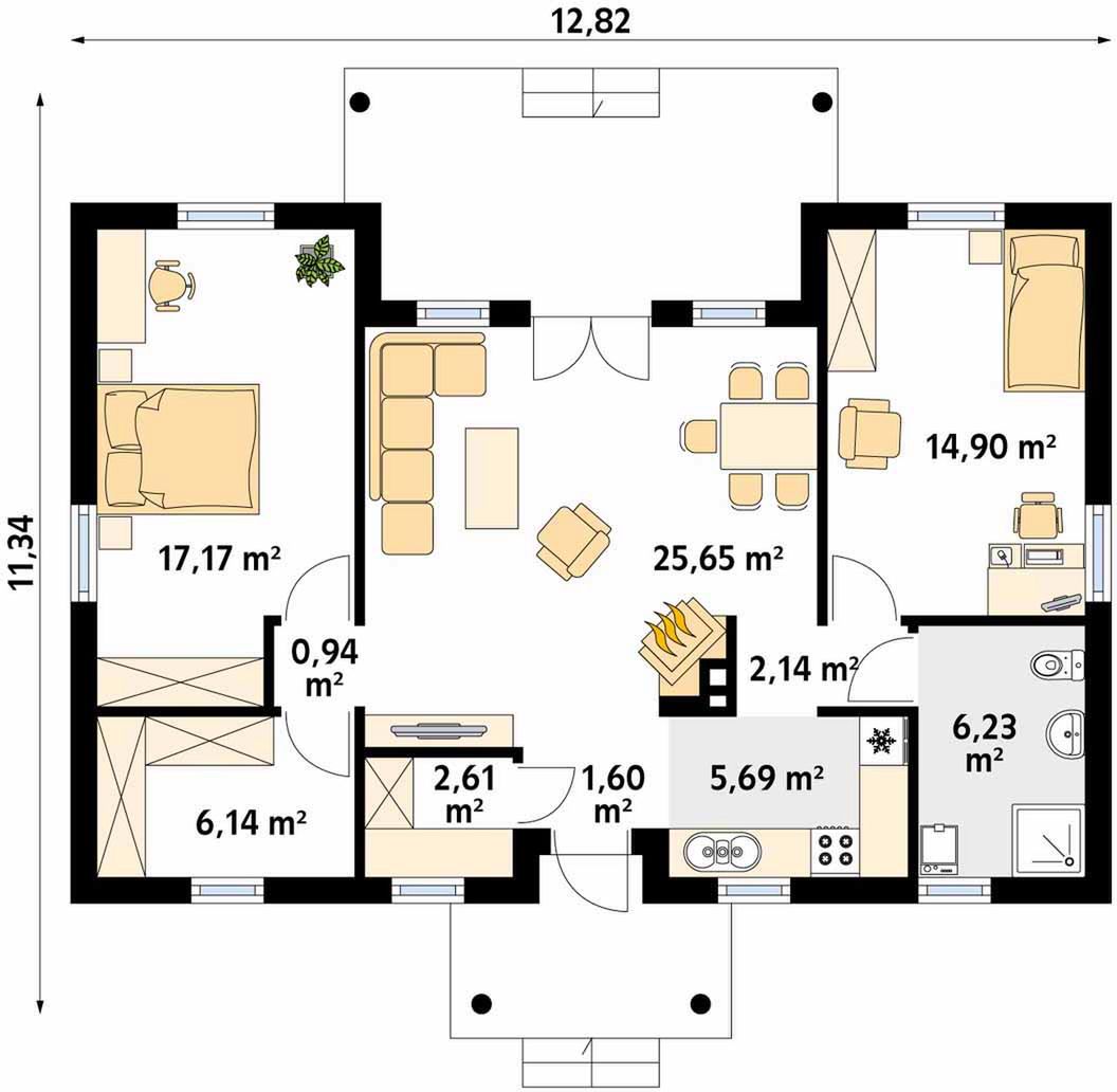 Graficzne opracowanie rzutów poglądowych widocznych na karcie projektu zostało wykonane przez Extradom.pl. Prezentowane przez Extradom.pl wizualizacje wykonane zostały przez autora projektu i należy poczytywać je jedynie za przykład i propozycję wykończenia, wizję architektoniczną autora projektu. Ostateczne wykończenie budynku może nastąpić na wiele sposobów. Szczegółowe rozwiązania zastosowane w oferowanej dokumentacji - w tym również ilość, lokalizacje i wygląd okien, drzwi, kominów - mogą w niewielkim stopniu różnić się od prezentowanej wizualizacji budynku.