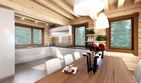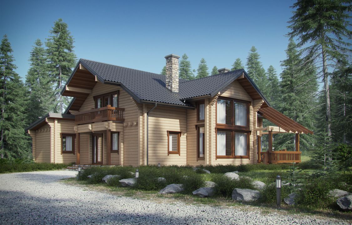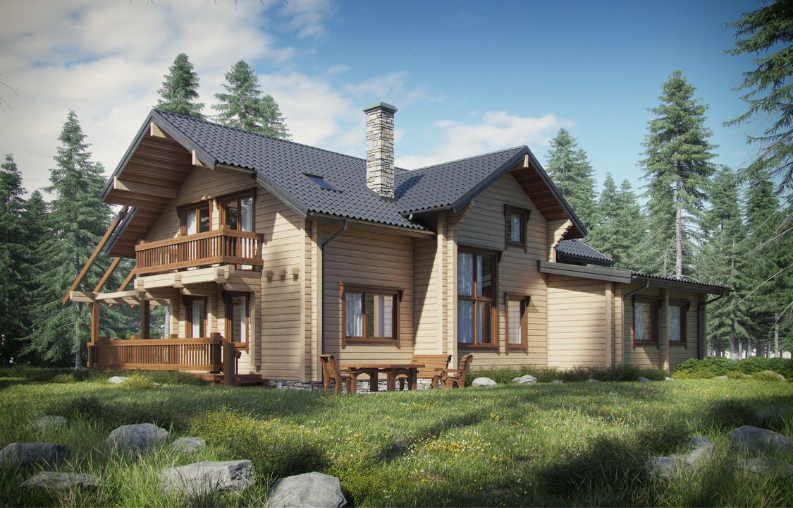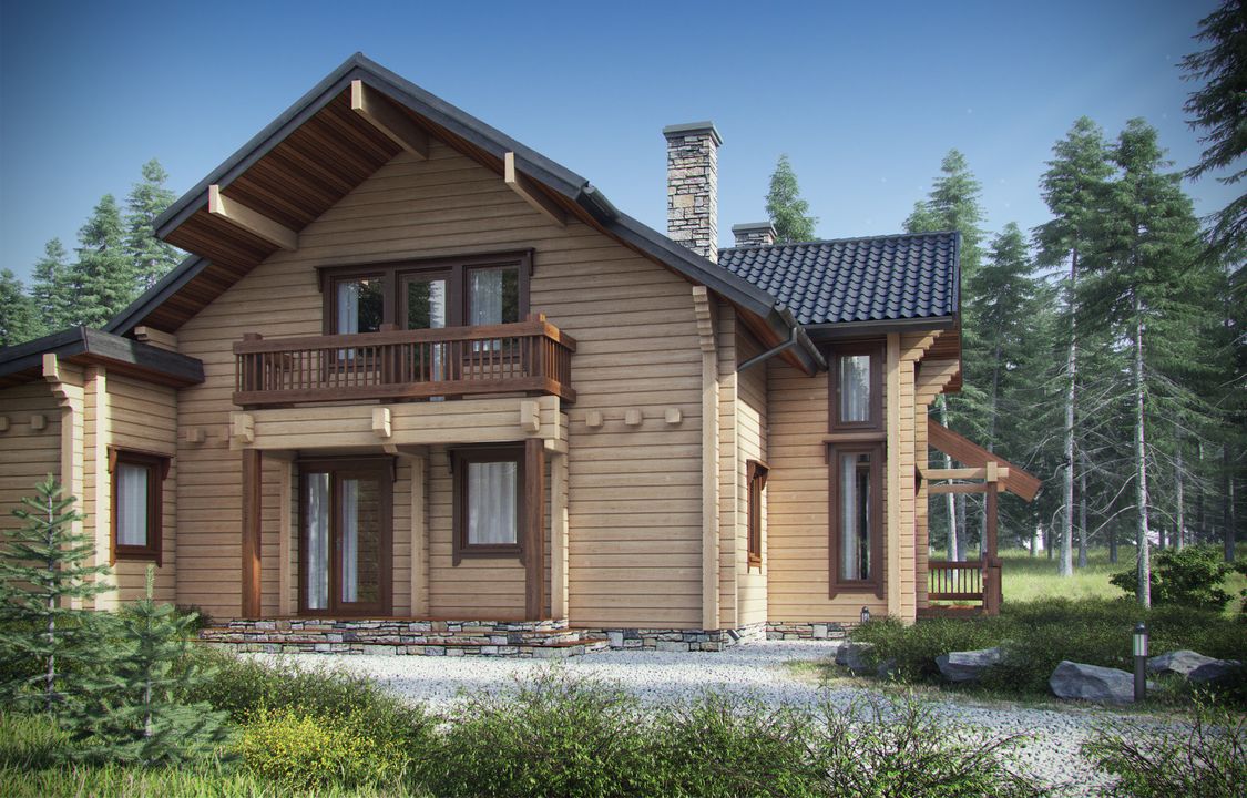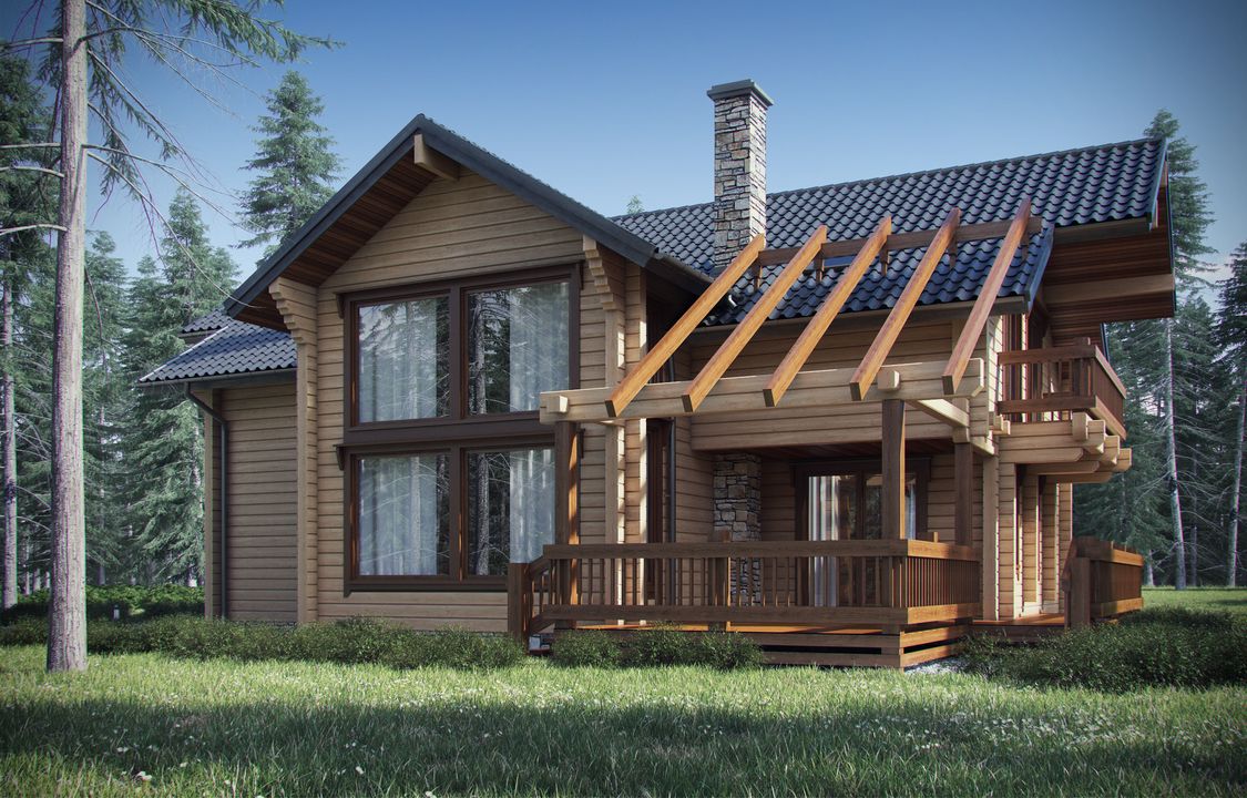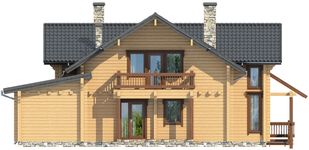 ściany zwnętrzne: bal drewniany kwadratowy, ściany wewnętrzne: bal drewniany klejony, elewacja: drewniana, strop: dźwigar dachowy, pokrycie dachu: blachodachówka w kształcie gontu.