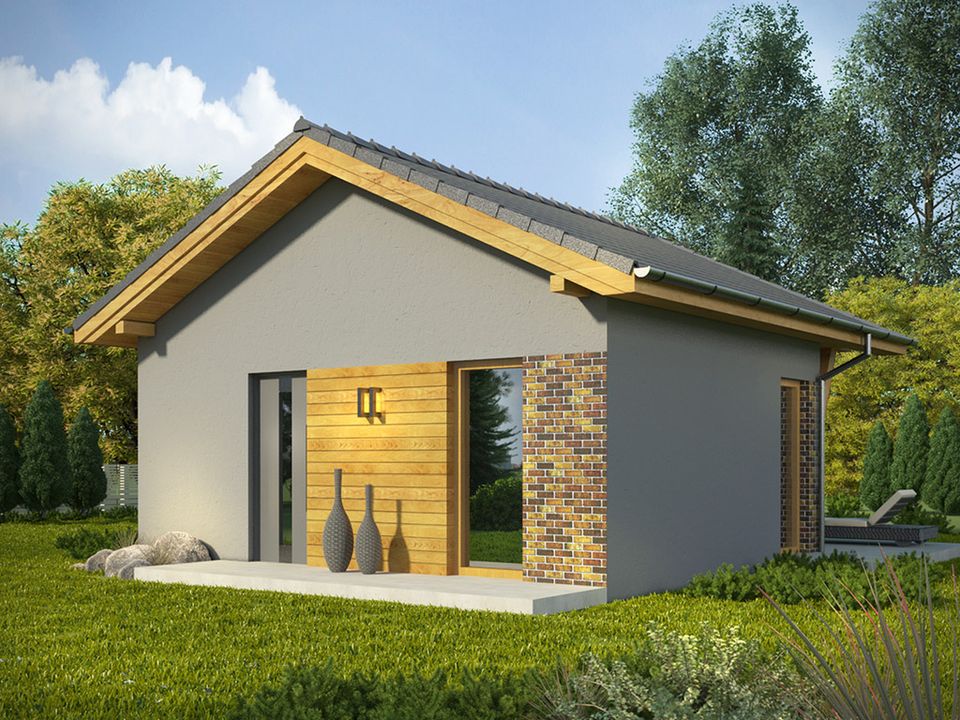 Ściany wznieść można w technologii tradycyjnej, czyli z gazobetonu docieplonego styropianem. Konstrukcja dachu do wykonania z wiązarów drewnianych. Elewacje wykończone są tynkiem, w projekcie przewidziano również akcenty w drewnie oraz obłożone płytką klinkierową. Sufit podwieszony do elementów więźby dachowej.