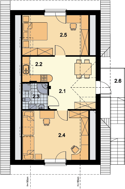 Graficzne opracowanie rzutów poglądowych widocznych na karcie projektu zostało wykonane przez Extradom.pl. Prezentowane przez Extradom.pl wizualizacje wykonane zostały przez autora projektu i należy poczytywać je jedynie za przykład i propozycję wykończenia, wizję architektoniczną autora projektu. Ostateczne wykończenie budynku może nastąpić na wiele sposobów. Szczegółowe rozwiązania zastosowane w oferowanej dokumentacji - w tym również ilość, lokalizacje i wygląd okien, drzwi, kominów - mogą w niewielkim stopniu różnić się od prezentowanej wizualizacji budynku.