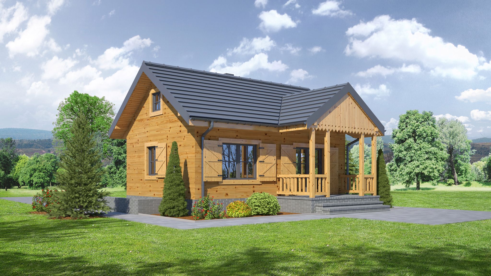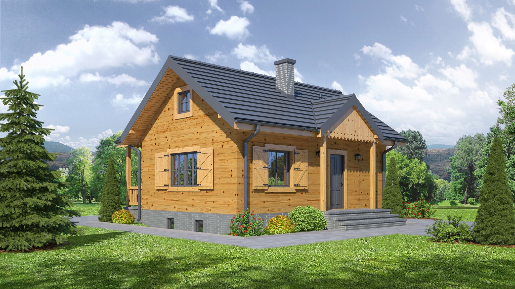 Graficzne opracowanie rzutów poglądowych widocznych na karcie projektu zostało wykonane przez Extradom.pl. Prezentowane przez Extradom.pl wizualizacje wykonane zostały przez autora projektu i należy poczytywać je jedynie za przykład i propozycję wykończenia, wizję architektoniczną autora projektu. Ostateczne wykończenie budynku może nastąpić na wiele sposobów. Szczegółowe rozwiązania zastosowane w oferowanej dokumentacji - w tym również ilość, lokalizacje i wygląd okien, drzwi, kominów - mogą w niewielkim stopniu różnić się od prezentowanej wizualizacji budynku.