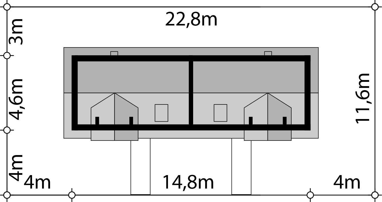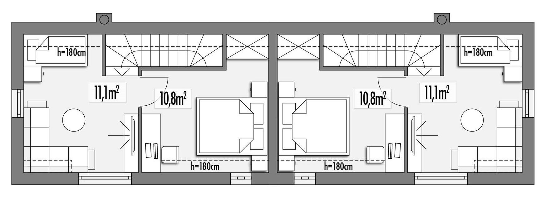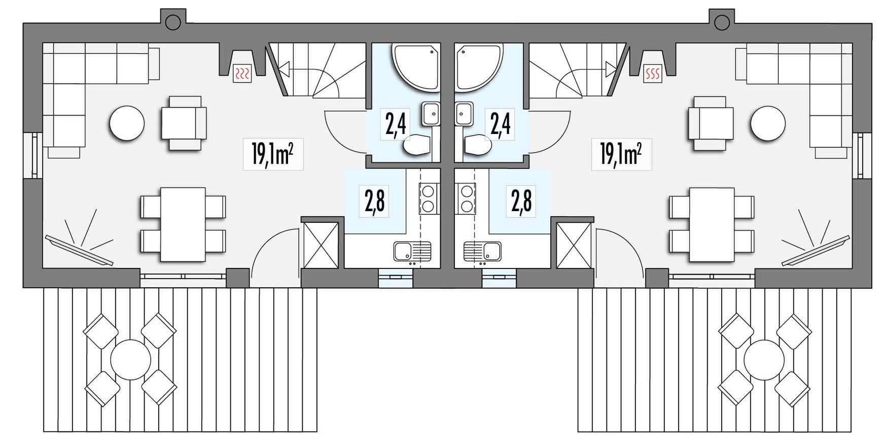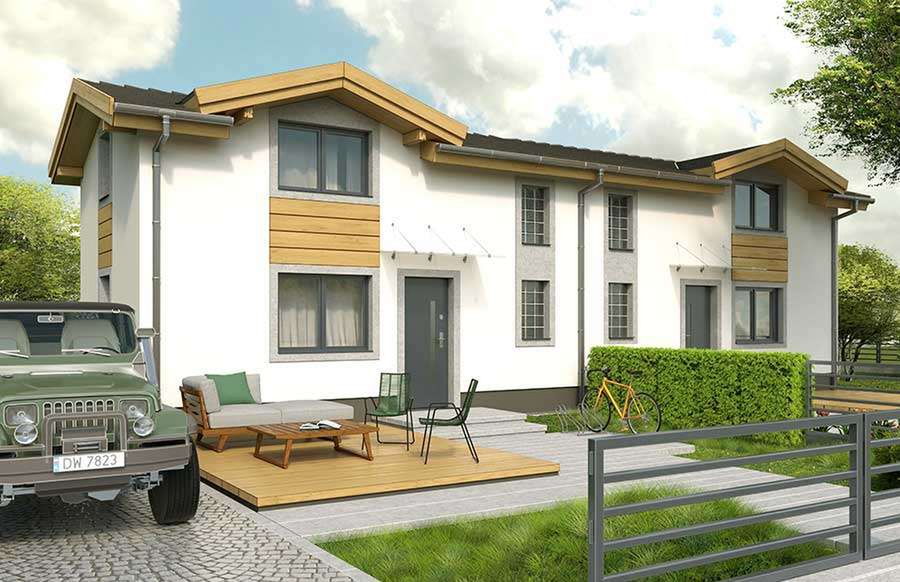 Graficzne opracowanie rzutów poglądowych widocznych na karcie projektu zostało wykonane przez Extradom.pl. Prezentowane przez Extradom.pl wizualizacje wykonane zostały przez autora projektu i należy poczytywać je jedynie za przykład i propozycję wykończenia, wizję architektoniczną autora projektu. Ostateczne wykończenie budynku może nastąpić na wiele sposobów. Szczegółowe rozwiązania zastosowane w oferowanej dokumentacji - w tym również ilość, lokalizacje i wygląd okien, drzwi, kominów - mogą w niewielkim stopniu różnić się od prezentowanej wizualizacji budynku.