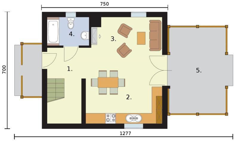 Technologia tradycyjna: - powierzchnia zabudowy budynku -49,64m2- powierzchnia werandy i podestów -24,05m2- powierzchnia użytkowa parteu + weranda + poddasze = 37,41 + 17,46 + 27,79m2- kubatura -395,00- ściany zewnętrzne murowane gr. 30 cm - ściany wewnętrzne (nośne) gr. 25 cm i działowe gr. 12 cm- wszystkie ściany wykonane z pustaków ceramicznych "POROTHERM" - strop gęstożebrowy "POROTHERM" o gr 23 cm. - konstrukcja więźby dachowej drewniana w układzie krokwiowym- pokrycie dachówka ceramiczna - projekt posiada kominek - istnieje możliwość adaptacji obiektu na budynek całoroczny - w przypadku wersji całorocznej docieplenie warstwą styropianu gr. 10 cm. - instalacja grzewcza w wersji całorocznej : kocioł gazowy zlokalizowany w łazience Technologia szkieletu drewnianego : - ściany zewnętrzne : słupki 4x15 rozstawione max. co 40cm obite zewnątrz płytą OSB 3 1,2cm , a wewnątrz płytą GK 1,25cm , przestrzeń pomiędzy słupkami wypełniona wełną mineralną 15cm. - ściana wewnętrzna : słupki 4x7 rozstawione max. co 40cm obite z dwóch stron płytą GK 1,25cm przestrzeń pomiędzy słupkami wypełniona wełną mineralną 7cm - konstrukcja więźby dachowej drewniana, pokrycie dachówka ceramiczna. - istnieje mozliwośc adaptacji obiektu na budynek całoroczny - docieplenie warstwą styropianu gr. 10 cm.