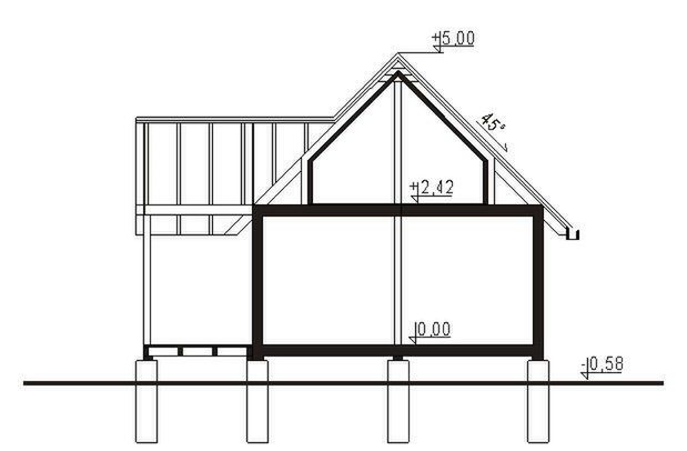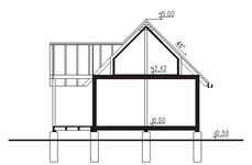 Ściany zewnętrzne: grubość 17 cm, szkieletowe drewniane. Strop: drewniany. Schody: drewniane. Dach: dwuspadowy o nachyleniu 45 stopni, więźba płatwiowo-krokwiowa, krycie dachówką bitumiczną lub blachą głęboko tłoczoną. Poziom kalenicy: 5,60 m od terenu. Dodatkowe informacje: dokumentacja zawiera projekty instalacji.