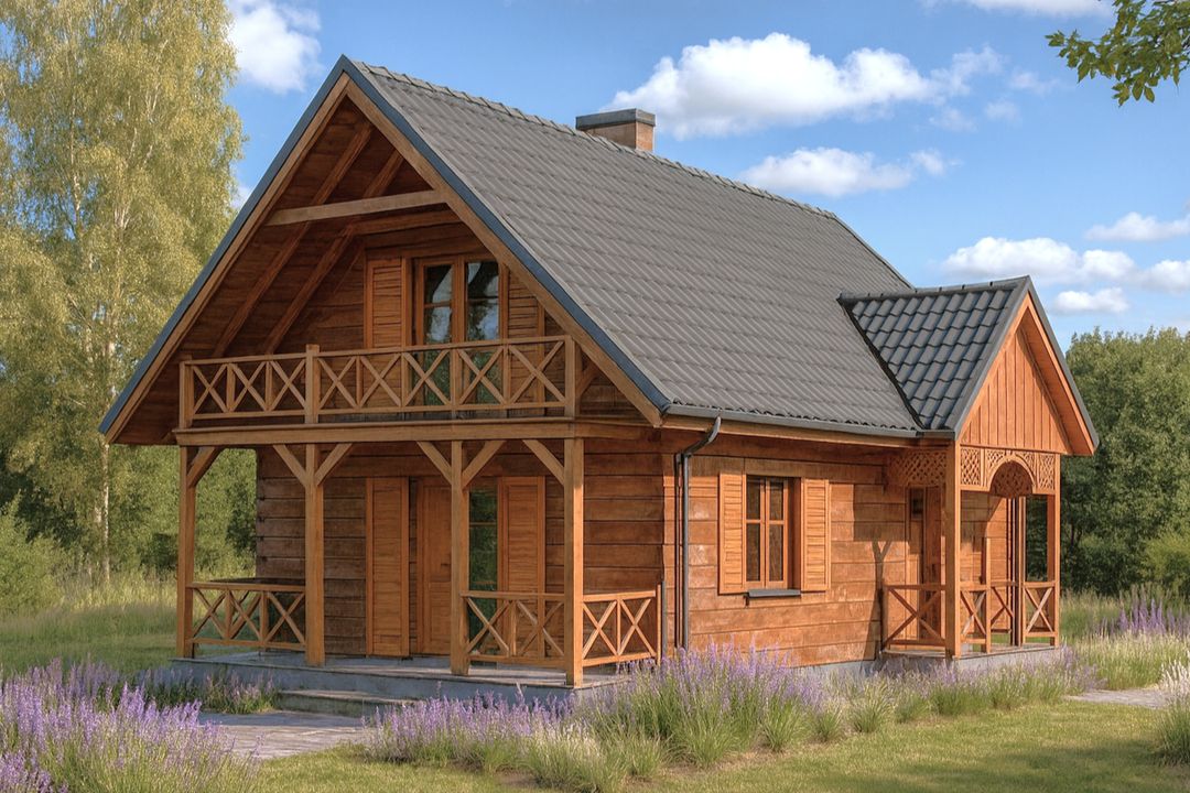 Ściany zewnętrzne: grubość 26 cm, szkieletowe drewniane. Strop: drewniany. Schody: drewniane. Dach: dwuspadowy o nachyleniu 45 stopni, więźba krokwiowo-jętkowa, krycie blachą dachówkową. Poziom kalenicy: 6,95 m od terenu. Dodatkowe informacje: ogrzewanie elektryczne,.
