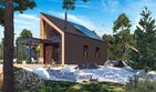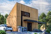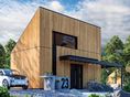 Fundamenty: ławy fundamentowe. Ściany zewnętrzne: murowane, dwuwarstwowe, beton komórkowy 18 cm, ocieplenie styropian 12 cm. Ściany wewnętrzne: działowe murowane, beton komórkowy 12 cm. Strop: drewniany. Dach: konstrukcja drewniana, ocieplenie wełna mineralna 26cm, krycie dachu: blacha trapezowa w kolorze antracytowym. Inne: schody wewnętrzne drewniane. Ogrzewanie: ogrzewanie elektryczne, rozprowadzenie ciepła: ogrzewanie podłogowe elektryczne, pojemnościowy ogrzewacz wody, całość zintegrowana z ogniwami fotowoltaicznymi. Wentylacja: grawitacyjna. Dodatkowo: panele fotowoltaiczne, gniazdo instalacji elektrycznej do ładowania auta. Elewacje: okładzina drewniana wg technologii montażu i barwienia drewna wybranego producenta; rekomendowany kolor okładziny drewnianej: okładzina drewniana czarna - deski palone świerkowe lub modrzewiowe, jasne drewno - modrzew syberyjski lub świerk skandynawski, ułożenie desek pionowe; blacha trapezowa w kolorze antracytowym. Stolarka: drewniana, PVC lub aluminiowa, drzwi podnoszono-przesuwne typu HS, drzwi wejściowe kolorystycznie dopasowane do systemu okiennego. Okna połaciowe: rozwiązania technologiczne i wyłaz dachowy dopasowane do systemu pokrycia dachowego. Otoczenie: płyty tarasowe i kostka betonowa, system tarasowy - deska kompozytowa lub drewno naturalne w kolorze współgrającym z elewacją.