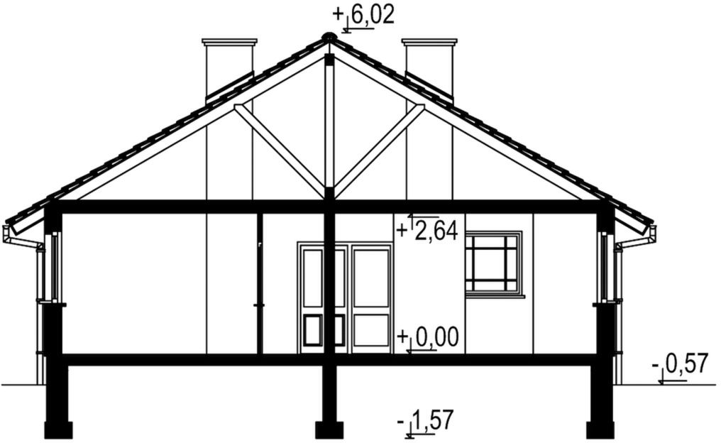 Ściany zewnętrzne dwuwarstwowe: cegła SILKA + wełna mineralna + tynk. Ściany wewnętrzne: cegła SILKA i/lub płyty na ruszcie stalowym, wygłuszone wełną mineralną. Strop: drewniany. Więźba dachowa: tradycyjna drewniana. Poszycie dachu: dachówka cementowa. Stolarka: drewniana lub PCV. Instalacja centralnego ogrzewania: kocioł dwufunkcyjny + grzejniki.