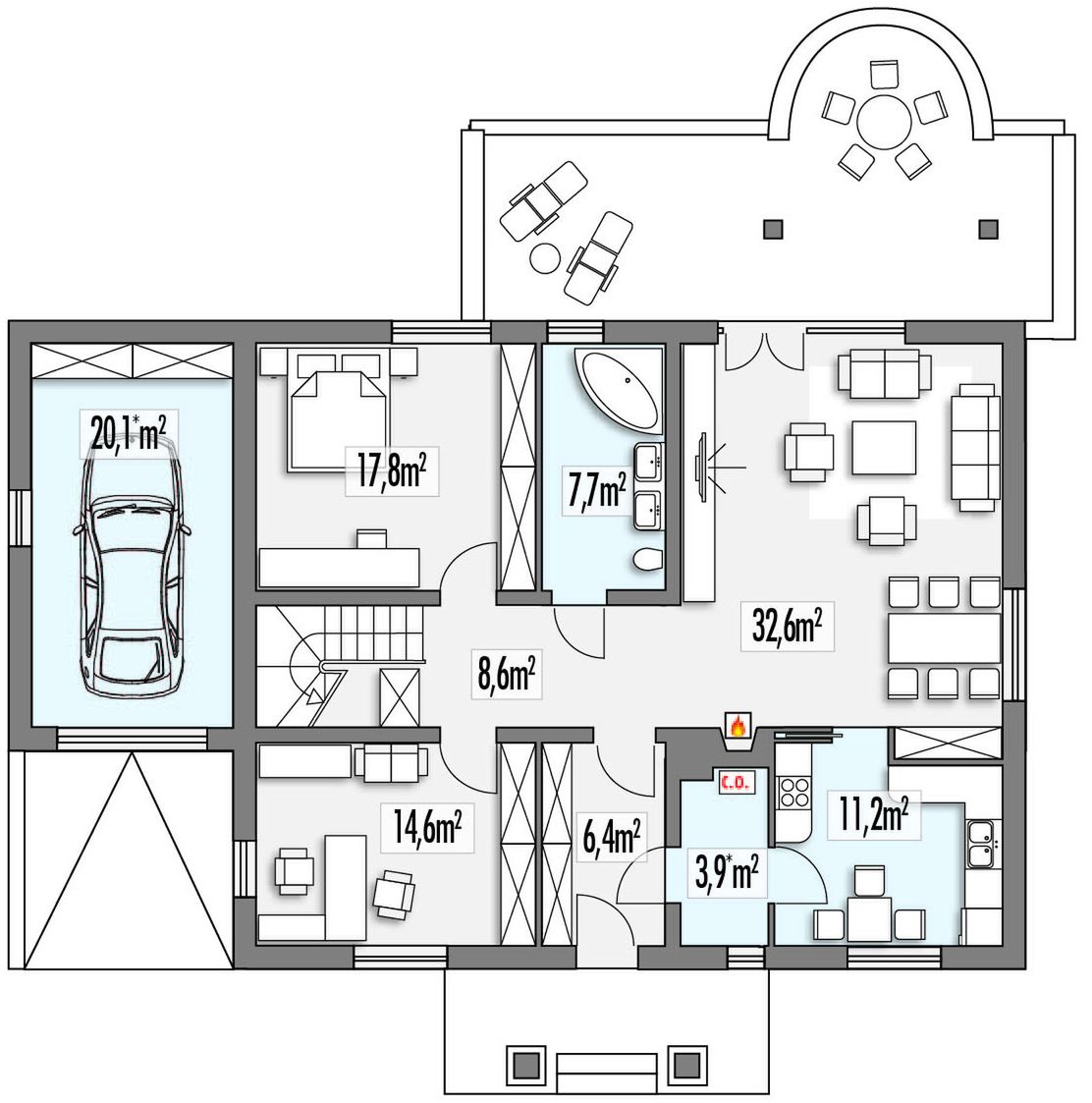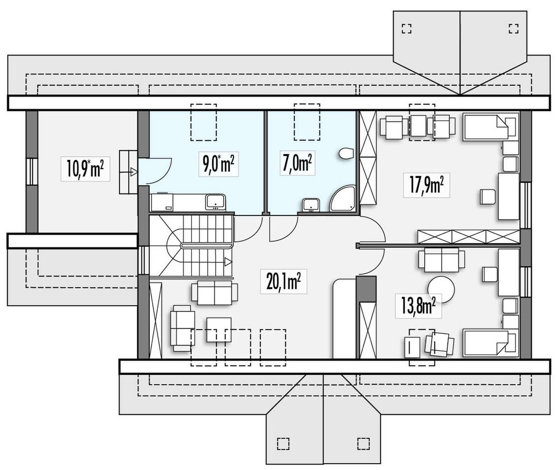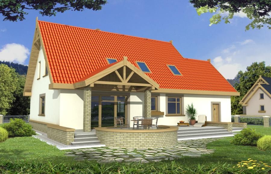 Graficzne opracowanie rzutów poglądowych widocznych na karcie projektu zostało wykonane przez Extradom.pl. Prezentowane przez Extradom.pl wizualizacje wykonane zostały przez autora projektu i należy poczytywać je jedynie za przykład i propozycję wykończenia, wizję architektoniczną autora projektu. Ostateczne wykończenie budynku może nastąpić na wiele sposobów. Szczegółowe rozwiązania zastosowane w oferowanej dokumentacji - w tym również ilość, lokalizacje i wygląd okien, drzwi, kominów - mogą w niewielkim stopniu różnić się od prezentowanej wizualizacji budynku.