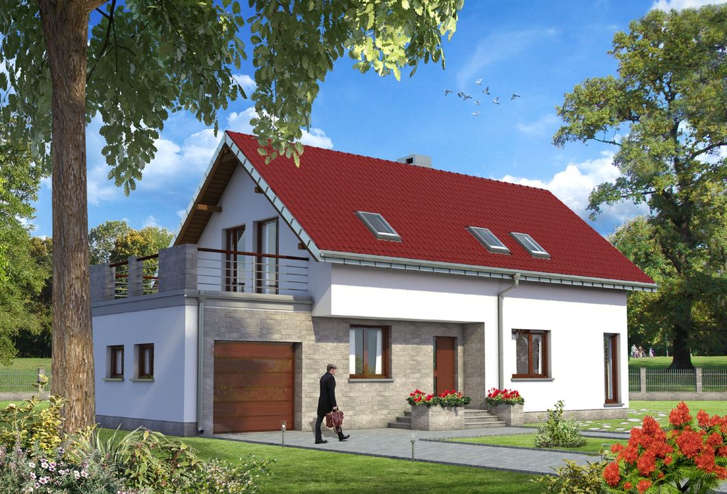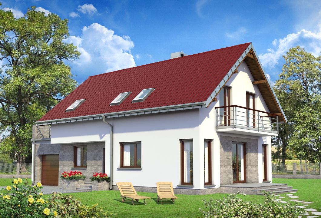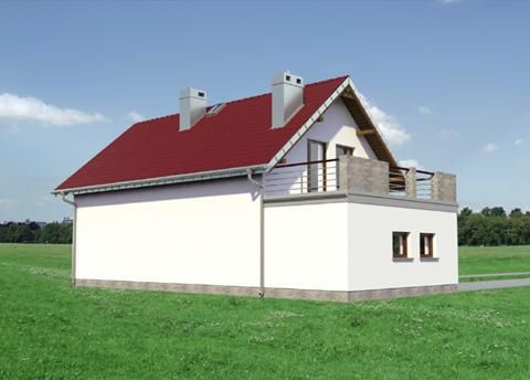 Graficzne opracowanie rzutów poglądowych widocznych na karcie projektu zostało wykonane przez Extradom.pl. Prezentowane przez Extradom.pl wizualizacje wykonane zostały przez autora projektu i należy poczytywać je jedynie za przykład i propozycję wykończenia, wizję architektoniczną autora projektu. Ostateczne wykończenie budynku może nastąpić na wiele sposobów. Szczegółowe rozwiązania zastosowane w oferowanej dokumentacji - w tym również ilość, lokalizacje i wygląd okien, drzwi, kominów - mogą w niewielkim stopniu różnić się od prezentowanej wizualizacji budynku.