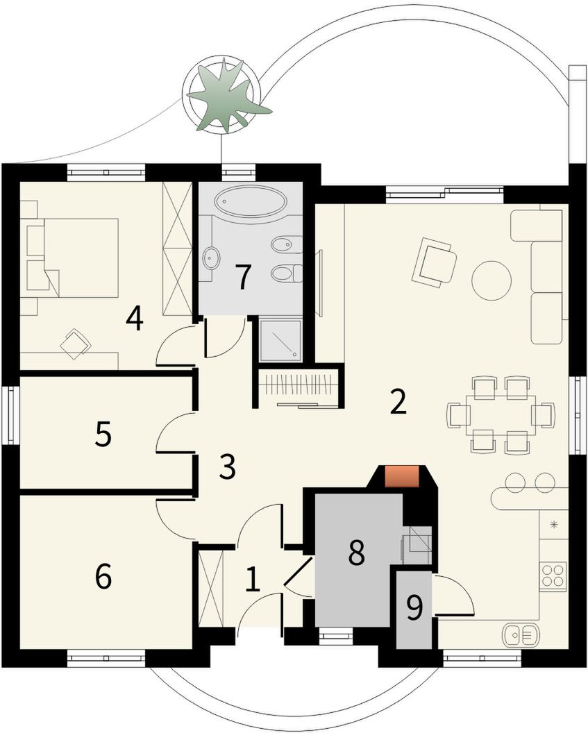 Graficzne opracowanie rzutów poglądowych widocznych na karcie projektu zostało wykonane przez Extradom.pl. Prezentowane przez Extradom.pl wizualizacje wykonane zostały przez autora projektu i należy poczytywać je jedynie za przykład i propozycję wykończenia, wizję architektoniczną autora projektu. Ostateczne wykończenie budynku może nastąpić na wiele sposobów. Szczegółowe rozwiązania zastosowane w oferowanej dokumentacji - w tym również ilość, lokalizacje i wygląd okien, drzwi, kominów - mogą w niewielkim stopniu różnić się od prezentowanej wizualizacji budynku.