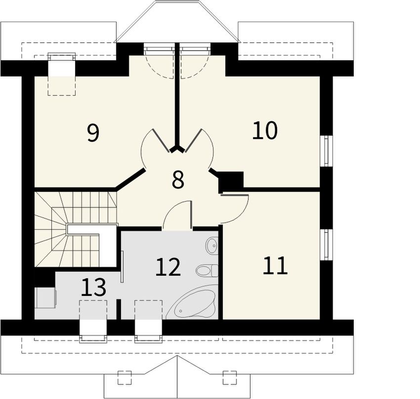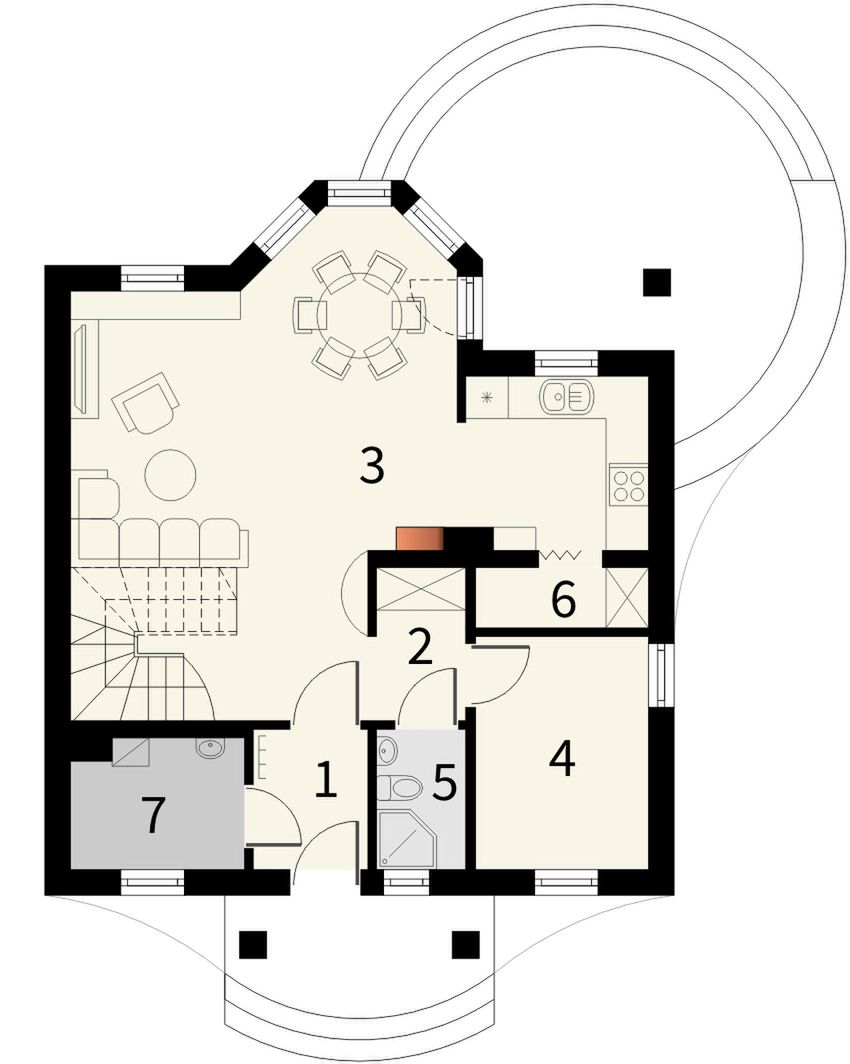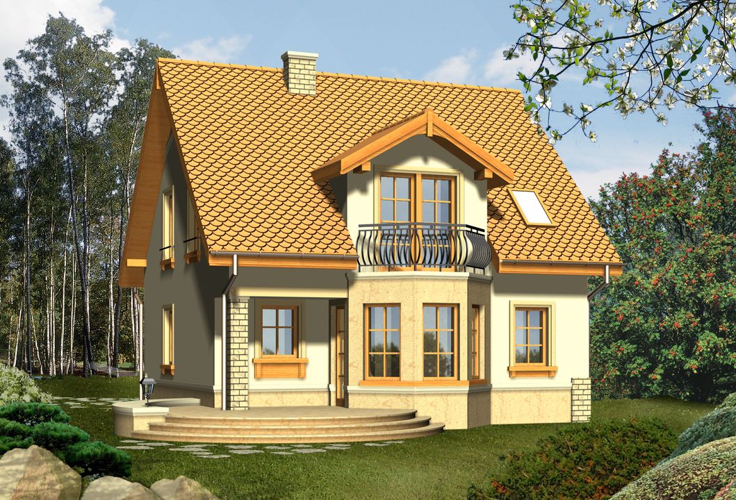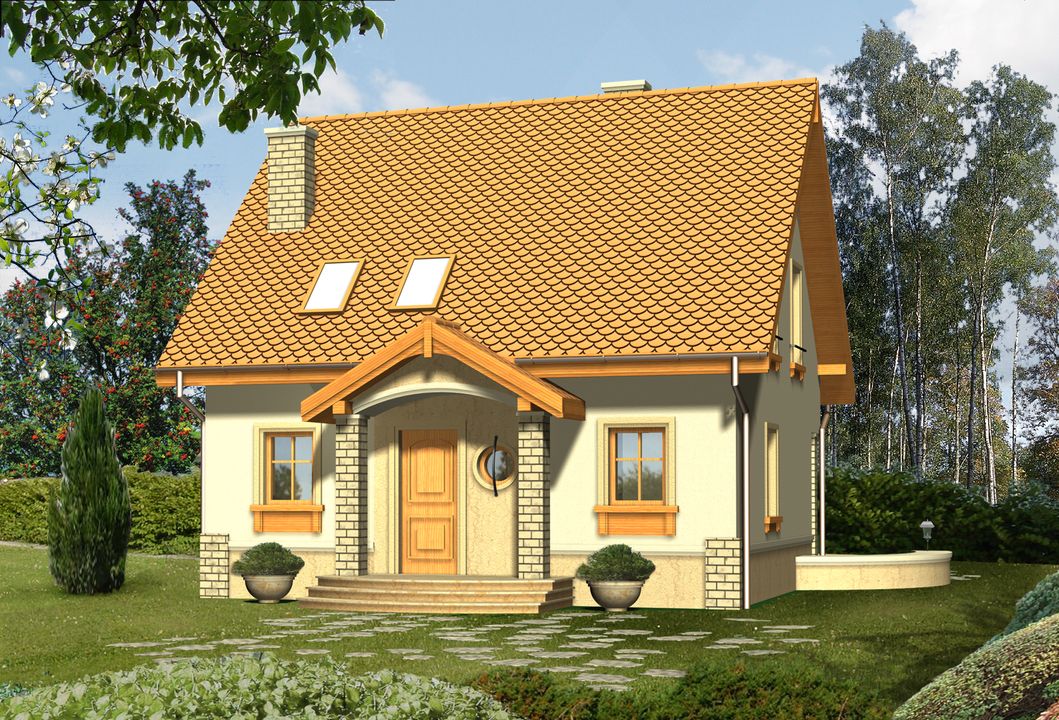 Graficzne opracowanie rzutów poglądowych widocznych na karcie projektu zostało wykonane przez Extradom.pl. Prezentowane przez Extradom.pl wizualizacje wykonane zostały przez autora projektu i należy poczytywać je jedynie za przykład i propozycję wykończenia, wizję architektoniczną autora projektu. Ostateczne wykończenie budynku może nastąpić na wiele sposobów. Szczegółowe rozwiązania zastosowane w oferowanej dokumentacji - w tym również ilość, lokalizacje i wygląd okien, drzwi, kominów - mogą w niewielkim stopniu różnić się od prezentowanej wizualizacji budynku.