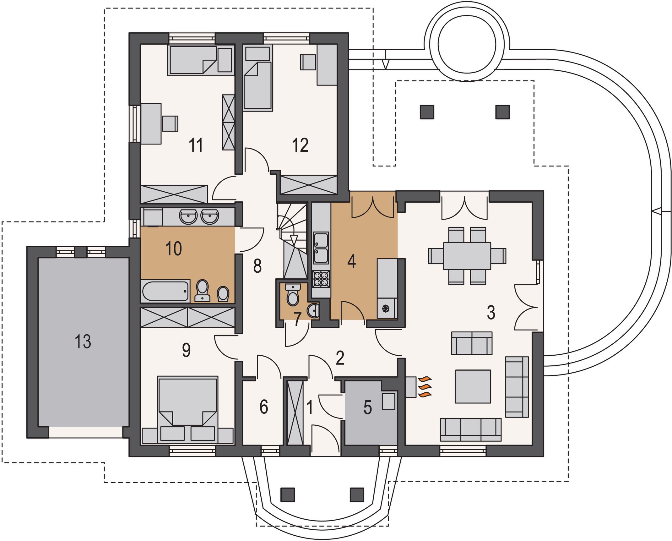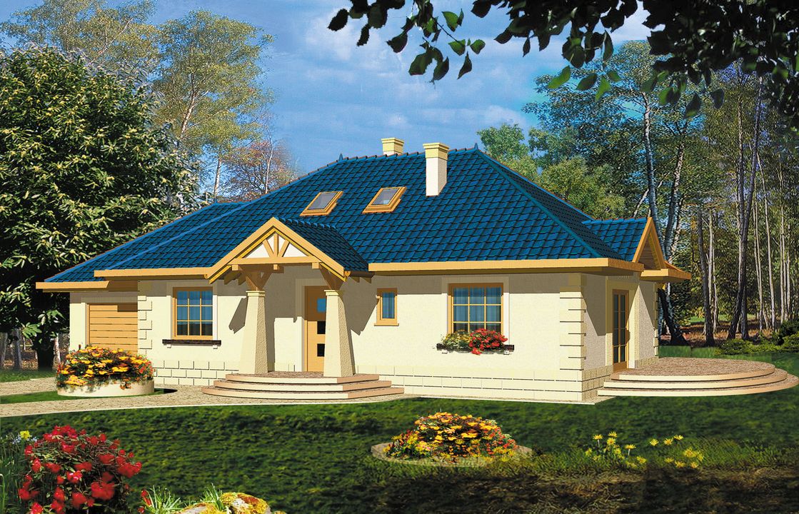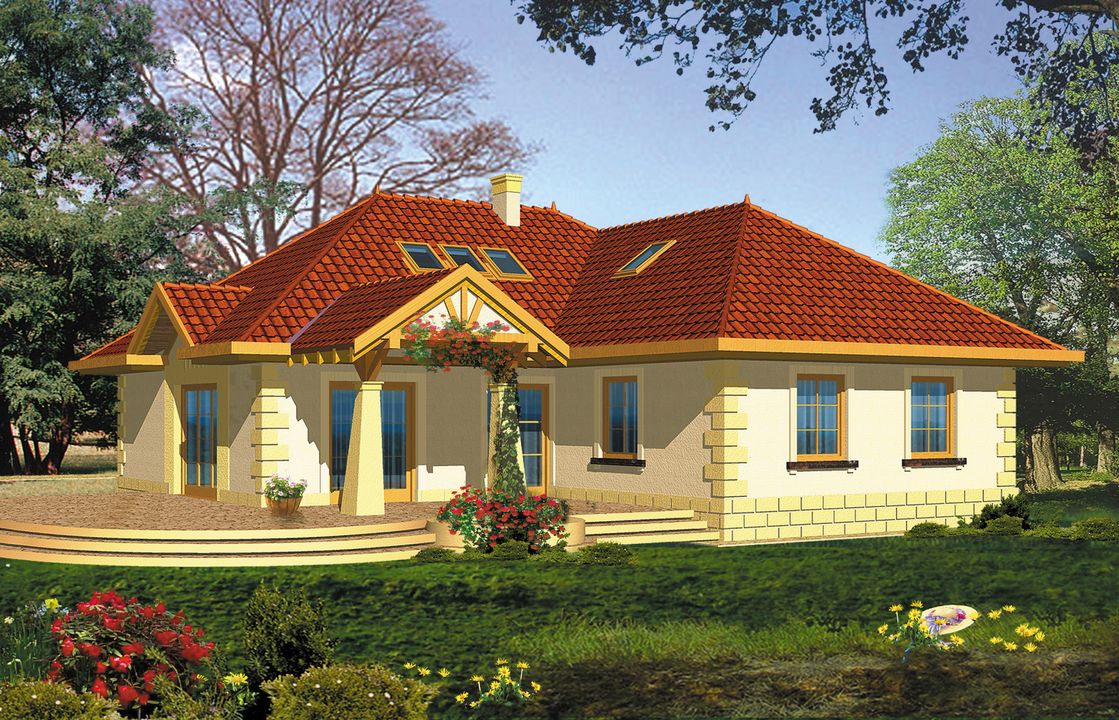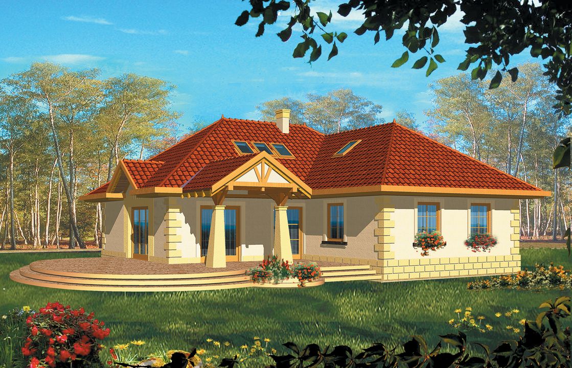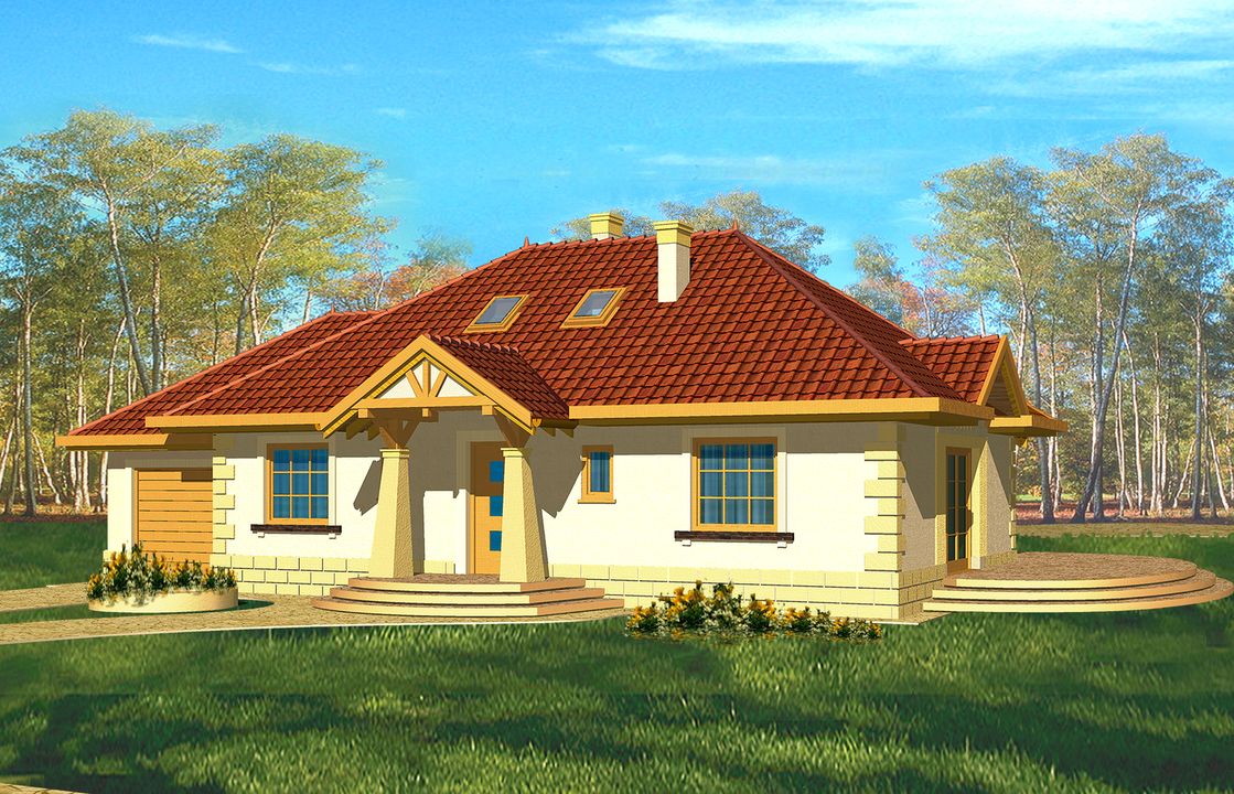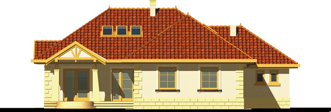 Graficzne opracowanie rzutów poglądowych widocznych na karcie projektu zostało wykonane przez Extradom.pl. Prezentowane przez Extradom.pl wizualizacje wykonane zostały przez autora projektu i należy poczytywać je jedynie za przykład i propozycję wykończenia, wizję architektoniczną autora projektu. Ostateczne wykończenie budynku może nastąpić na wiele sposobów. Szczegółowe rozwiązania zastosowane w oferowanej dokumentacji - w tym również ilość, lokalizacje i wygląd okien, drzwi, kominów - mogą w niewielkim stopniu różnić się od prezentowanej wizualizacji budynku.
