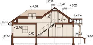 Konstrukcja ściany zewnętrzne - beton komórkowy gr.24cm+styropian Termo Organika Termonium Plus 16cm ; ściany wewnetrzne - bloczki z betonu komórkowego gr.24cm; ściany fundamentowe - bloczek betonowy; strop - Teriva; konstrukcja dachu - drewniana Instalacje W projekcie przewidziano instalacjie: c.o. i c.w.u., grzejniki płytowe, instalacje wodno-kanalizacyjna oraz elektryczne, wentylacja grawitacyjna. W projekcie znajduję się rowież projekt wentylacji mechanicznej Wykończenie pokrycie dachowe - dachówka cementowa (w ramach adaptacji inny materiał); ścianki działowe na parterze-bloczek silikatowy; schody - drewniane zabiegowe; okna - PVC; okna dachowe i wyłaz dachowy - Fakro.
