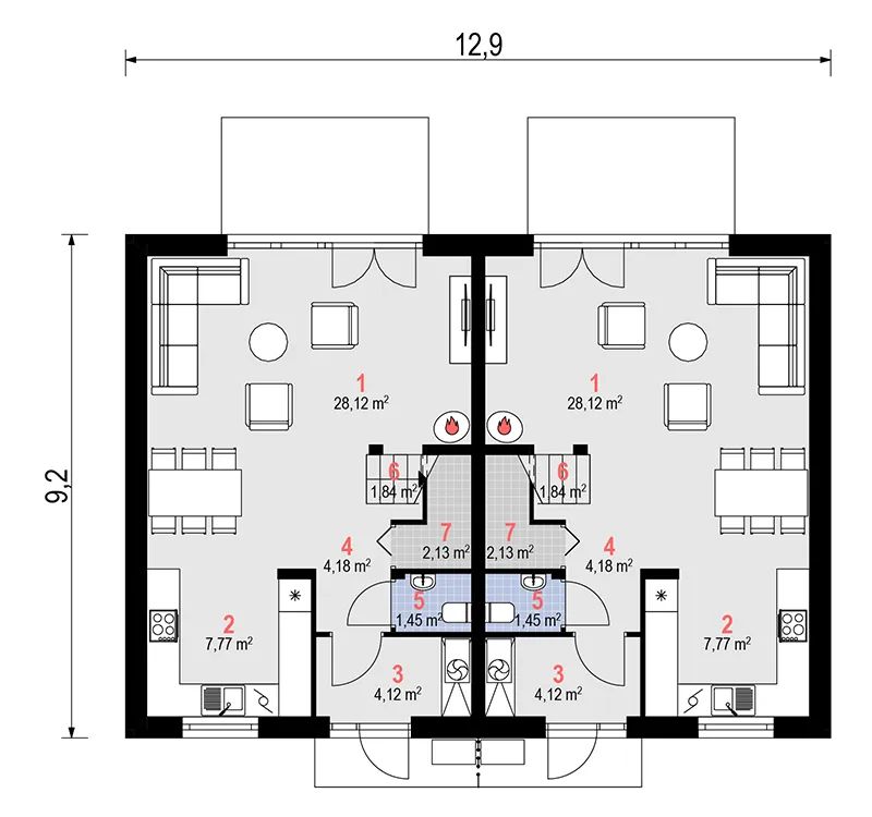 Graficzne opracowanie rzutów poglądowych widocznych na karcie projektu zostało wykonane przez Extradom.pl. Prezentowane przez Extradom.pl wizualizacje wykonane zostały przez autora projektu i należy poczytywać je jedynie za przykład i propozycję wykończenia, wizję architektoniczną autora projektu. Ostateczne wykończenie budynku może nastąpić na wiele sposobów. Szczegółowe rozwiązania zastosowane w oferowanej dokumentacji - w tym również ilość, lokalizacje i wygląd okien, drzwi, kominów - mogą w niewielkim stopniu różnić się od prezentowanej wizualizacji budynku.