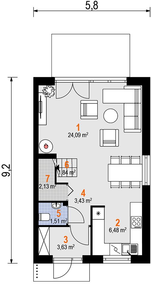 Graficzne opracowanie rzutów poglądowych widocznych na karcie projektu zostało wykonane przez Extradom.pl. Prezentowane przez Extradom.pl wizualizacje wykonane zostały przez autora projektu i należy poczytywać je jedynie za przykład i propozycję wykończenia, wizję architektoniczną autora projektu. Ostateczne wykończenie budynku może nastąpić na wiele sposobów. Szczegółowe rozwiązania zastosowane w oferowanej dokumentacji - w tym również ilość, lokalizacje i wygląd okien, drzwi, kominów - mogą w niewielkim stopniu różnić się od prezentowanej wizualizacji budynku.