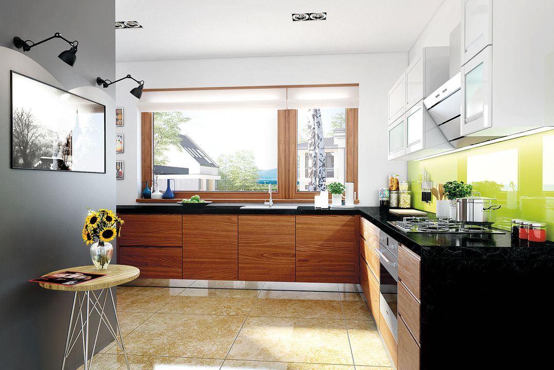 Ściany zewnętrzne: murowane, dwuwarstwowe, beton komórkowy 24 cm, ocieplenie styropian Termo Organika 20 cm. Strop: gęstożebrowy Teriva. Dach: konstrukcja drewniana, ocieplenie wełna mineralna Isover 30 cm, dachówka ceramiczna firmy Röben. Ogrzewanie: kocioł gazowy kondensacyjny, rozprowadzenie ciepła: grzejniki. Wentylacja: grawitacyjna. OZE: kolektory słoneczne. Elewacje: tynk cienkowarstwowy mineralny w kolorze TO-PA001 z palety firmy Termo Organika, okładzina z płyty HPL z naturalną okleiną drewnianą firmy Prodema. Stolarka: drewniana, PVC lub aluminiowa, drzwi wejściowe i brama garażowa firmy Hörmann. Otoczenie: system tarasowy ProDeck - deska kompozytowa Terra w kolorze złoty dąbW przypadku adaptacji poddasza na cele mieszkalne rozwiązania technologiczne i wyłaz dachowy firmy VELUX.