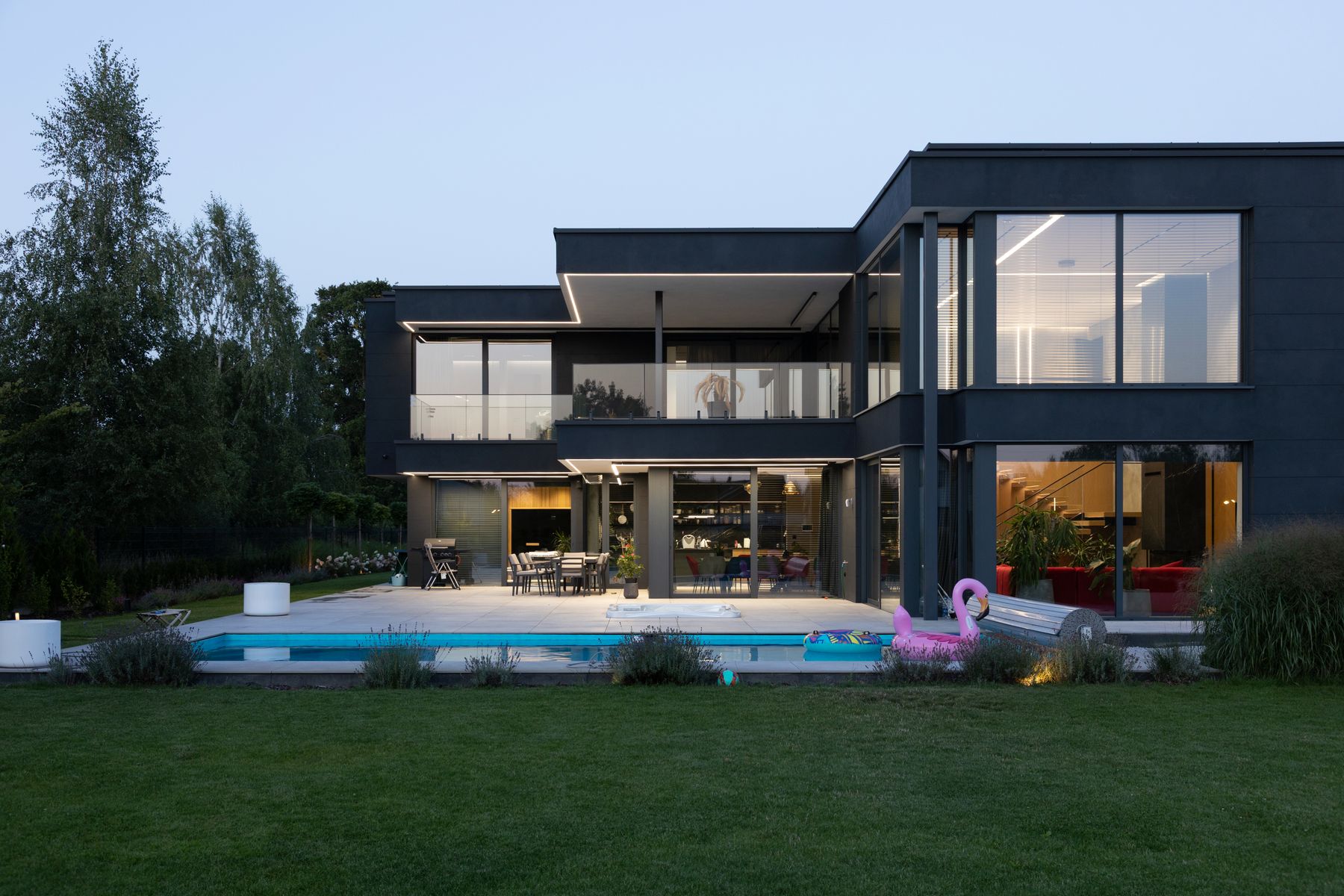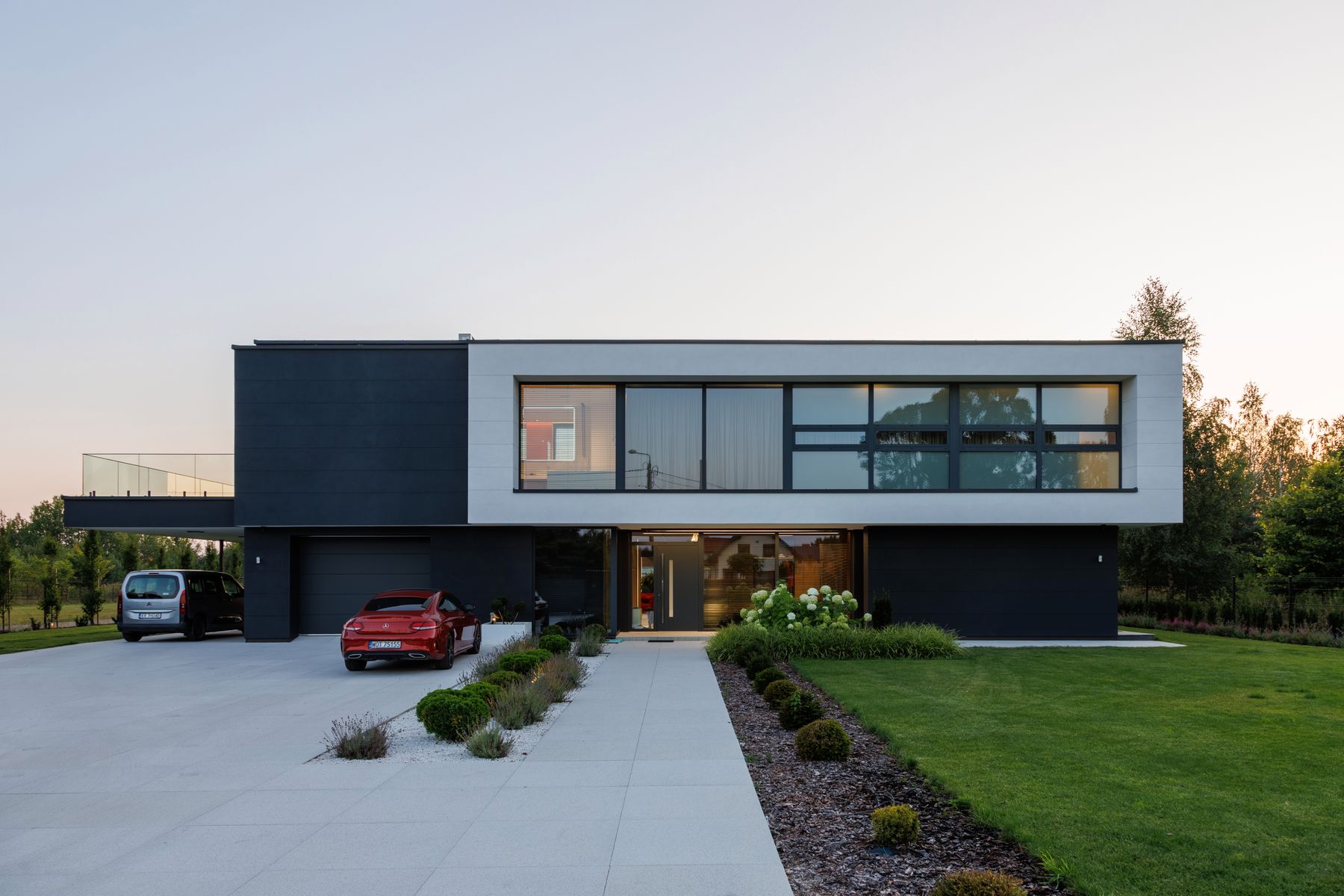 Ławy fundamentowe: żelbetowе. Ściany fundamentowe: bloczki betonowe, docieplenie polistyren ekstrudowany XPS. Ściany zewnętrzne: pustak ceramiczny Porotherm o gr. 30 cm firmy Wienerberger, docieplenie styropian Termonium/ wełna mineralna Isover. Ściany wewnętrzne: nośne pustaki ceramiczne Porotherm Dryfix firmy Wienerberger o gr. 25 cm. Ściany działowe pustaki ceramiczne Porotherm Dryfix firmy Wienerberger o gr. 11,5 cm. Stropy żelbetowy, monolityczny. Konstrukcja dachu: stropodach. Elewacje płyty elewacyjne Laminam. Okna i drzwi: aluminiowe firmy Aluprof. Sposób ogrzewania: Gazowe, podłogowe. Wentylacja: mechaniczna z rekuperacją.