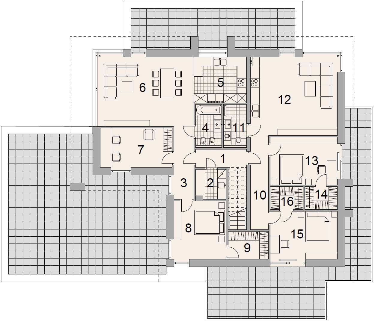 Graficzne opracowanie rzutów poglądowych widocznych na karcie projektu zostało wykonane przez Extradom.pl. Prezentowane przez Extradom.pl wizualizacje wykonane zostały przez autora projektu i należy poczytywać je jedynie za przykład i propozycję wykończenia, wizję architektoniczną autora projektu. Ostateczne wykończenie budynku może nastąpić na wiele sposobów. Szczegółowe rozwiązania zastosowane w oferowanej dokumentacji - w tym również ilość, lokalizacje i wygląd okien, drzwi, kominów - mogą w niewielkim stopniu różnić się od prezentowanej wizualizacji budynku.