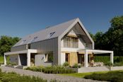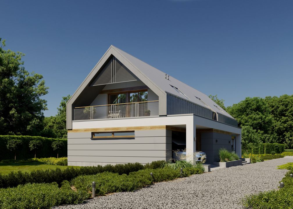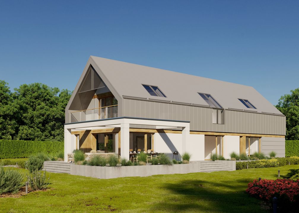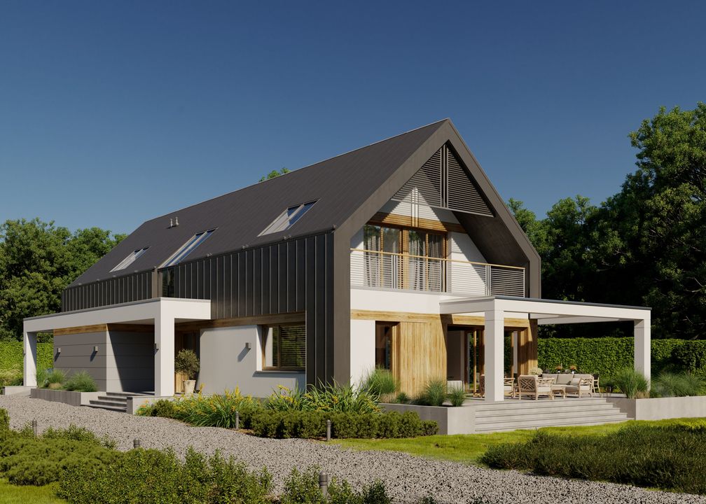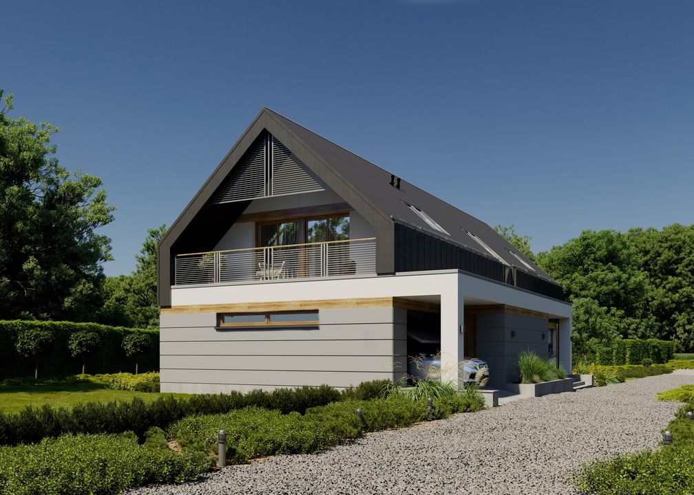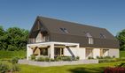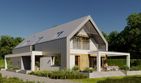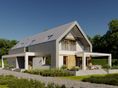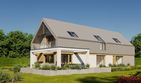 Graficzne opracowanie rzutów poglądowych widocznych na karcie projektu zostało wykonane przez Extradom.pl. Prezentowane przez Extradom.pl wizualizacje wykonane zostały przez autora projektu i należy poczytywać je jedynie za przykład i propozycję wykończenia, wizję architektoniczną autora projektu. Ostateczne wykończenie budynku może nastąpić na wiele sposobów. Szczegółowe rozwiązania zastosowane w oferowanej dokumentacji - w tym również ilość, lokalizacje i wygląd okien, drzwi, kominów - mogą w niewielkim stopniu różnić się od prezentowanej wizualizacji budynku.
