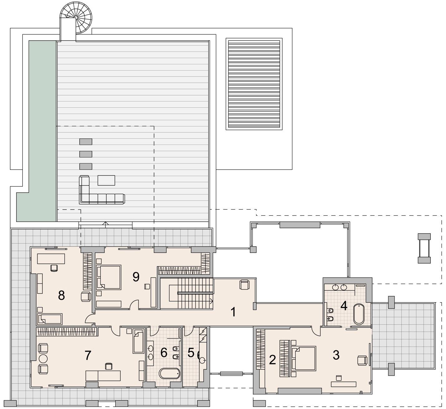 Ławy fundamentowe: żelbetowе. Ściany fundamentowe: żelbetowe, ocieplone styropianem ekstrudowanym o grub. 20 cm. Ściany zewnętrzne: pustak ceramiczny Porotherm Profi o gr. 30 cm firmy Wienerberger, docieplenie styropianem Termonium fasada firmy Termo Organika o gr. 20 cm. Ściany wewnętrzne: nośne pustaki ceramiczne Porotherm Dryfix firmy Wienerberger o gr. 25 cm. Ściany działowe pustaki ceramiczne Porotherm Dryfix firmy Wienerberger o gr. 11,5 cm. Stropy żelbetowy, monolityczny. Konstrukcja dachu: stropodach. Pokrycie dachu: żwir płukany. Elewacje tynk silikonowy zewnętrzny kolor biały. Okna i drzwi: aluminiowe. Sposób ogrzewania: pompa ciepła. Wentylacja: mechaniczna z rekuperacją.