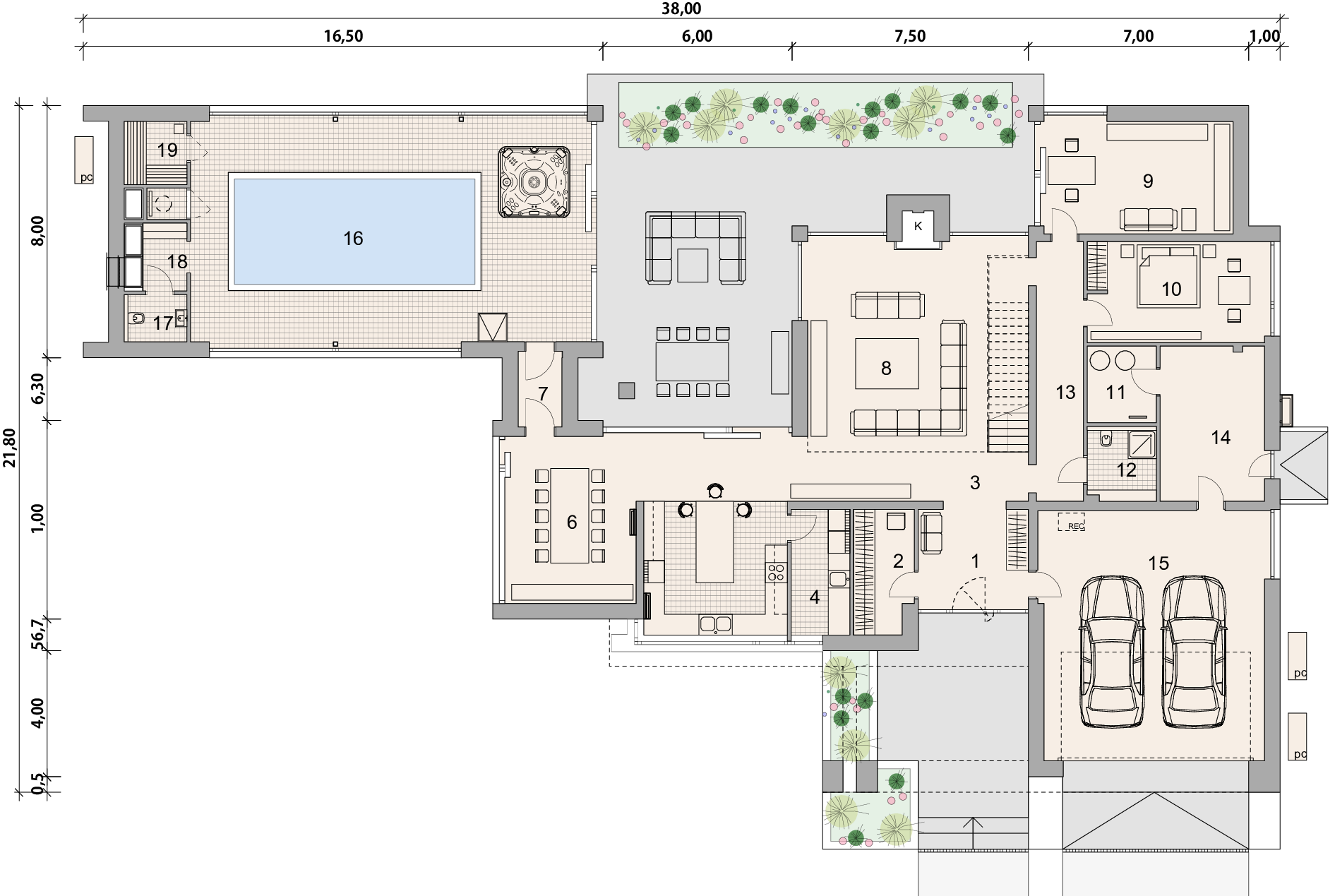 Ławy fundamentowe: ŻELBETOWE MONOLITYCZNE DLA BUDYNKU MIESZKALNEGO. Płyta fundamentowa ŻELBETOWA MONOLITYCZNA DLA POM. TECHNICZNEGO BASENU. Ściany fundamentowe: Z BLOCZKÓW BETONOWYCH DLA BUD. MIESZKALNEGO ŻELBETOWE MONOLITYCZNE DLA POM. TECHNICZNEGO BASENU. Ściany zewnętrzne: pustak ceramiczny Porotherm o gr. 30 cm firmy Wienerberger, docieplenie styro-pianem Termoorganika o gr. 20 cm. Ściany wewnętrzne: nośne pustaki ceramiczne Porotherm firmy Wienerberger o gr. 25 cm. Ściany działowe pustaki ceramiczne Porotherm firmy Wienerberger o gr. 11,5 cm. Stropy żelbetowy, monolityczny. Elewacje tynk silikonowy kolor biały, płyty ze spieków Laminam. Okna i drzwi: aluminiowe firmy Aluprof, brama garażowa Hörmann. Sposób ogrzewania: PODŁOGOWE ŹRÓDŁO CIEPŁA: POWIETRZNA POMPA CIEPŁA. Wentylacja: mechaniczna z rekuperacją. Instalacje dodatkowe KLIMATYZACJA, GROMADZENIE WODY DESZCZOWEJ.