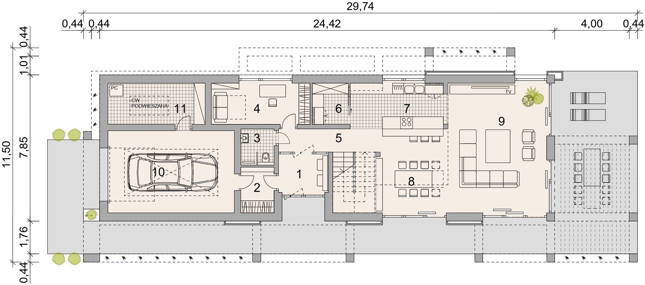 Projekt stanowi aktualną i pełną dokumentację zawierającą część architektoniczno - budowlaną, konstrukcyjną wykonawczą, instalacji wewnętrznych, elektrycznych i teletechnicznych, charakterystykę energetyczną oraz uprawnienia projektantów. Dokumentacja zabezpieczona jest specjalną plombą, której usunięcie uniemożliwi jej zwrot. Zapraszamy do zamówienia analizy posiadanej działki w celu upewnienia się, że wybrany projekt domu idealnie na nią pasuje.