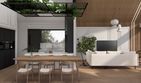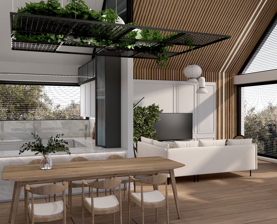 Ławy fundamentowe: żelbetowе. Ściany fundamentowe: bloczki betonowe, docieplenie polistyren ekstrudowany XPS. Ściany zewnętrzne: pustak ceramiczny Porotherm o gr. 30 cm firmy Wienerberger, docieplenie styropian Termonium/ wełna mineralna Isover. Ściany wewnętrzne: nośne pustaki ceramiczne Porotherm Dryfix firmy Wienerberger o gr. 25 cm. Ściany działowe pustaki ceramiczne Porotherm Dryfix firmy Wienerberger o gr. 11,5 cm. Stropy żelbetowy, monolityczny. Elewacje tynk zewnętrzny silikonowy kolor biały, płyty elewacyjne z paneli z drewna kompozytowego. Okna i drzwi: aluminiowe firmy Aluprof, brama garażowa Hörmann. Wentylacja: mechaniczna z rekuperacją.