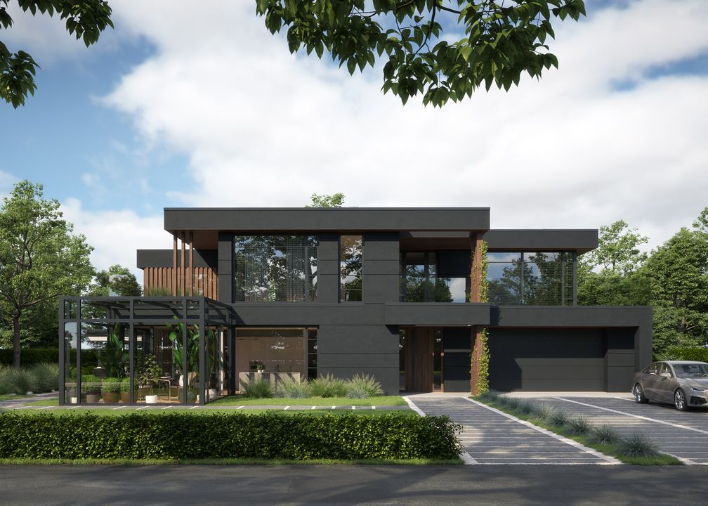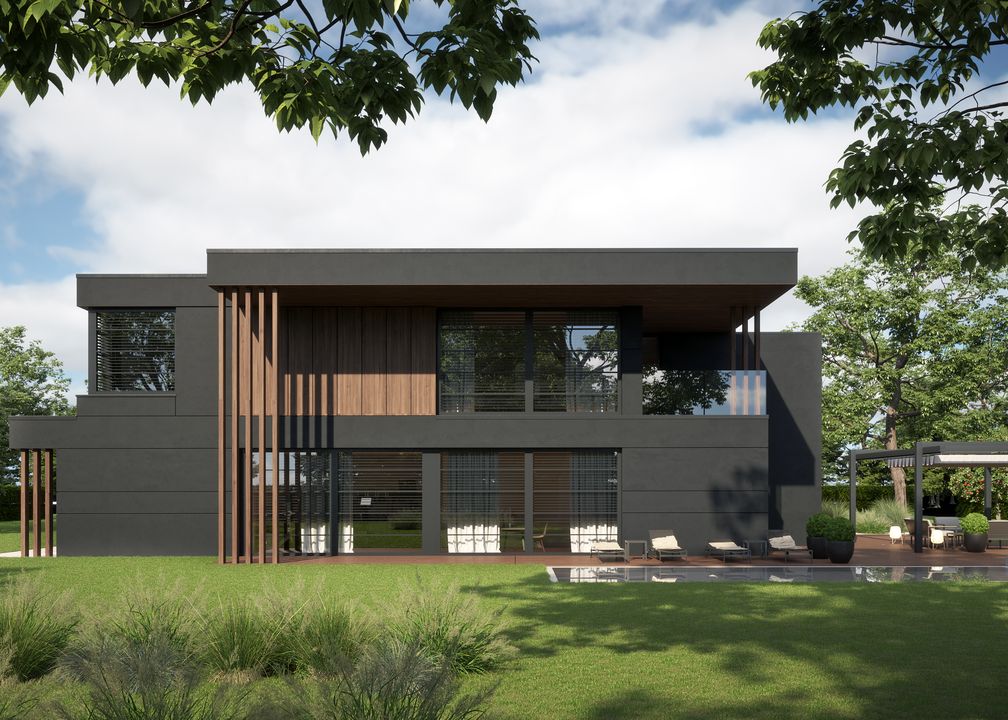 Ławy fundamentowe: żelbetowе. Ściany fundamentowe: betonowe. Ściany zewnętrzne: Pustak ceramiczny Porotherm 30 cm Dryfix Wienerberger. Ściany wewnętrzne: nośne Pustak ceramiczny Porotherm 25 cm i 18,8cm Dryfix Wienerberger. Ściany działowe Pustak ceramiczny Porotherm 11,5 cm Dryfix Wienerberger. Stropy żelbetowy, monolityczny. Konstrukcja dachu: stropodach tarasowy wg. systemu Bauder. Elewacje Tynk zewnętrzny silikonowy gładki antracytowy / Okładzina elewacyjna aluminowa Aluprof z okleiną drewnopodobną Orzech ADEC 0102. Okna i drzwi: aluminiowe Aluprof antracytowe, drzwi zewnętrzne aluminiowe w okładzinie drewnopodobnej Orzech ADEC 0102, brama garażowa Hörmann. Sposób ogrzewania: powietrzna pompa ciepła. Wentylacja: mechaniczna z rekuperacją.