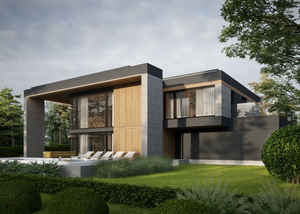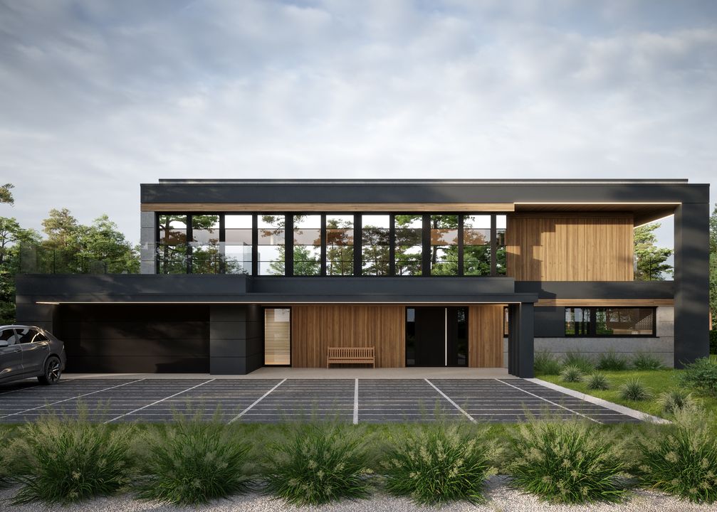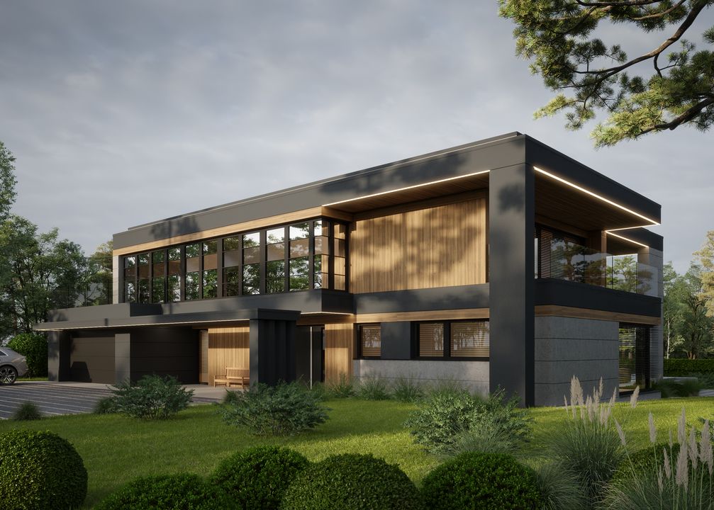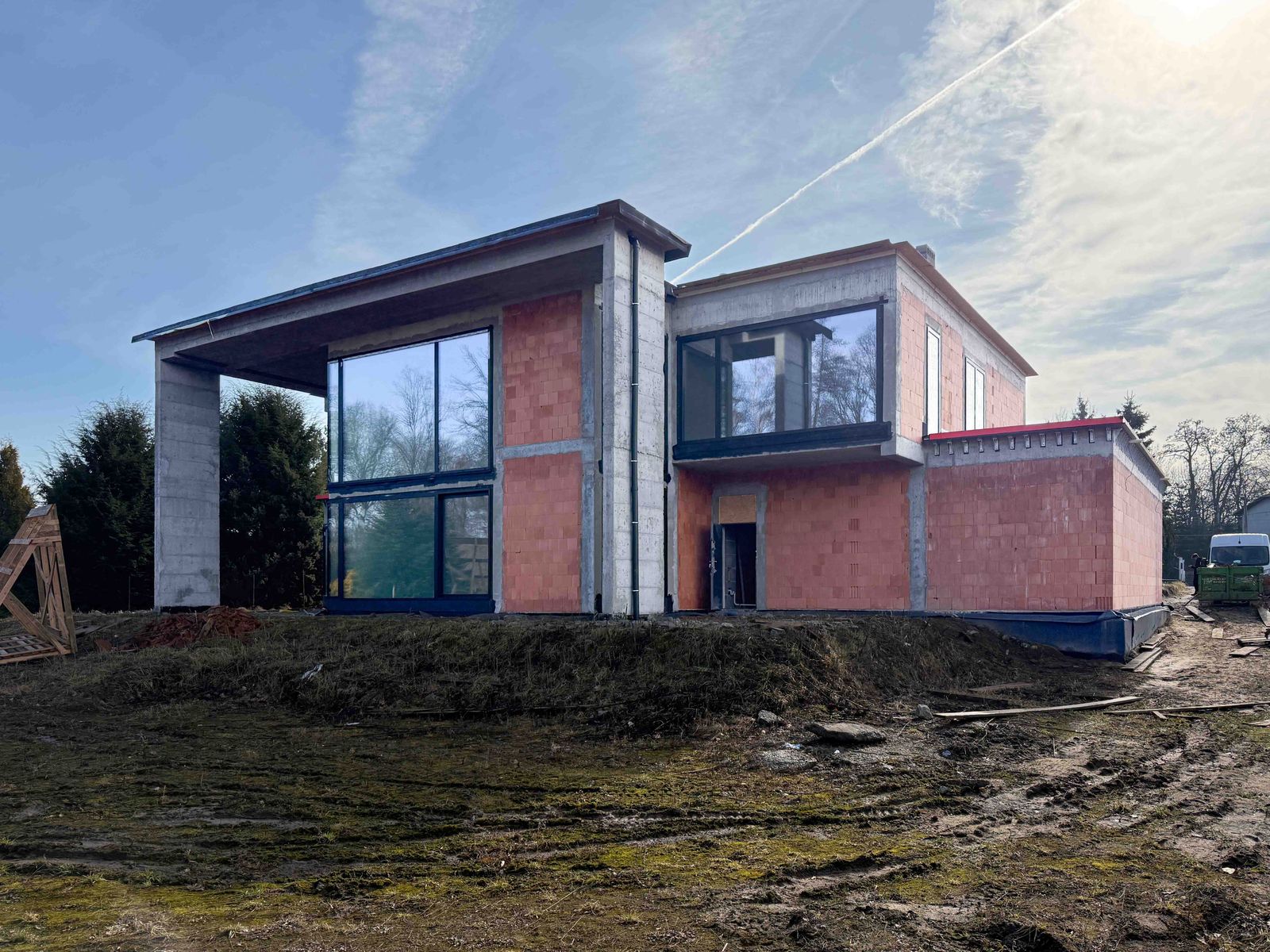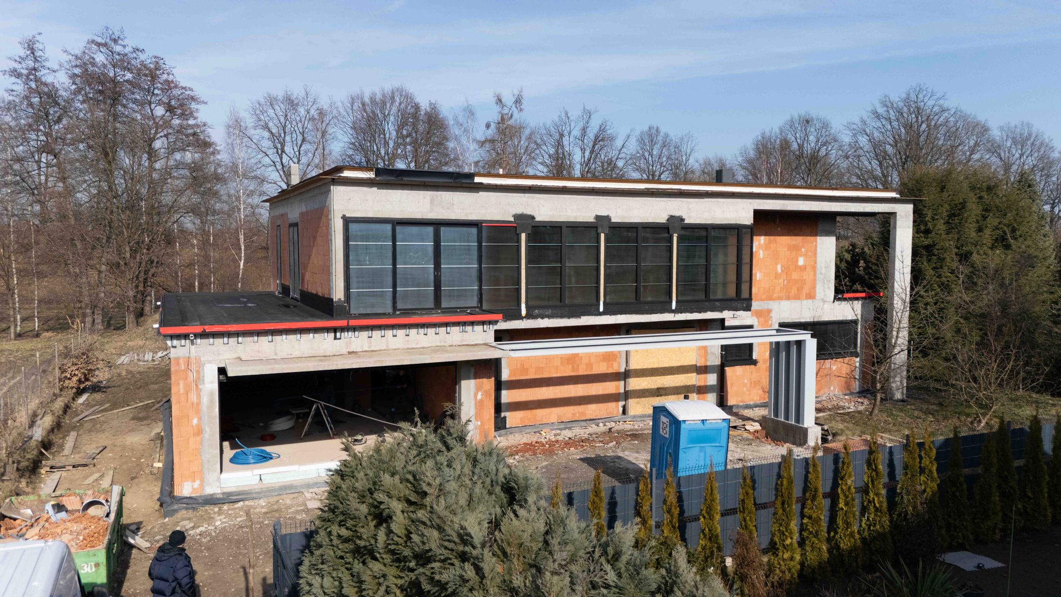 Ławy fundamentowe: żelbetowе. Ściany fundamentowe: bloczki betonowe, docieplenie polistyren ekstrudowany XPS. Ściany zewnętrzne: pustak ceramiczny Porotherm o gr. 30 cm firmy Wienerberger, docieplenie styropian Termonium/ wełna mineralna Isover. Ściany wewnętrzne: nośne pustaki ceramiczne Porotherm Dryfix firmy Wienerberger o gr. 25 cm. Ściany działowe pustaki ceramiczne Porotherm Dryfix firmy Wienerberger o gr. 11,5 cm. Stropy żelbetowy. Konstrukcja dachu: stropodach. Elewacje płyty elewacyjne: Z BETONU ARCHITEKTONICZNEGO, DESKA ELEWACYJNA THERMORY; tynk silikonowy. Okna i drzwi: aluminiowe firmy Aluprof, brama garażowa Hörmann. Sposób ogrzewania: Podłogowe. Wentylacja: mechaniczna z rekuperacją.