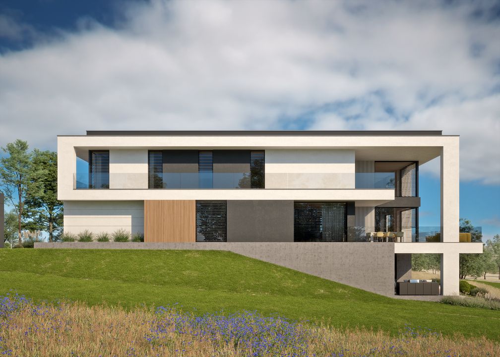 Graficzne opracowanie rzutów poglądowych widocznych na karcie projektu zostało wykonane przez Extradom.pl. Prezentowane przez Extradom.pl wizualizacje wykonane zostały przez autora projektu i należy poczytywać je jedynie za przykład i propozycję wykończenia, wizję architektoniczną autora projektu. Ostateczne wykończenie budynku może nastąpić na wiele sposobów. Szczegółowe rozwiązania zastosowane w oferowanej dokumentacji - w tym również ilość, lokalizacje i wygląd okien, drzwi, kominów - mogą w niewielkim stopniu różnić się od prezentowanej wizualizacji budynku.