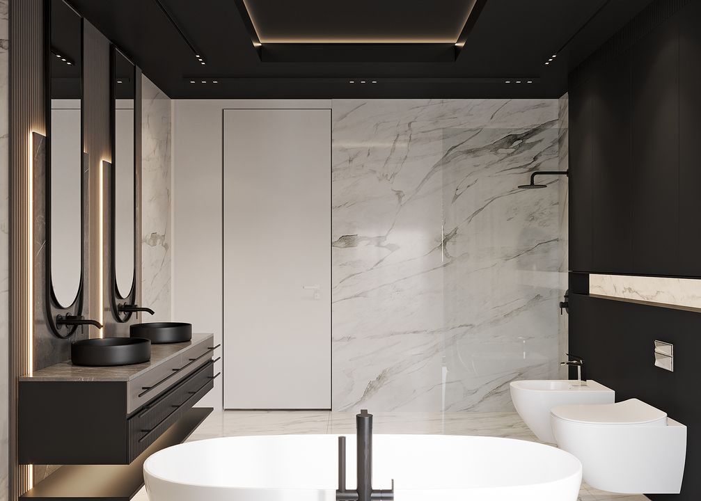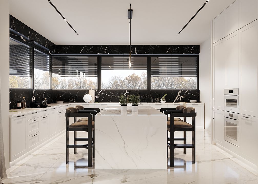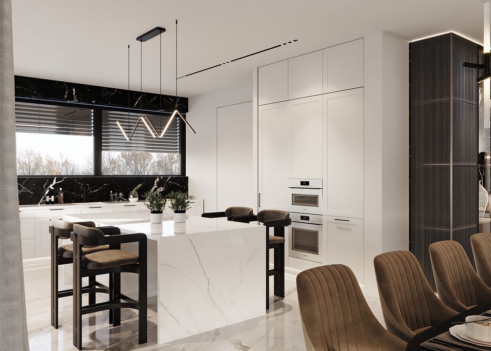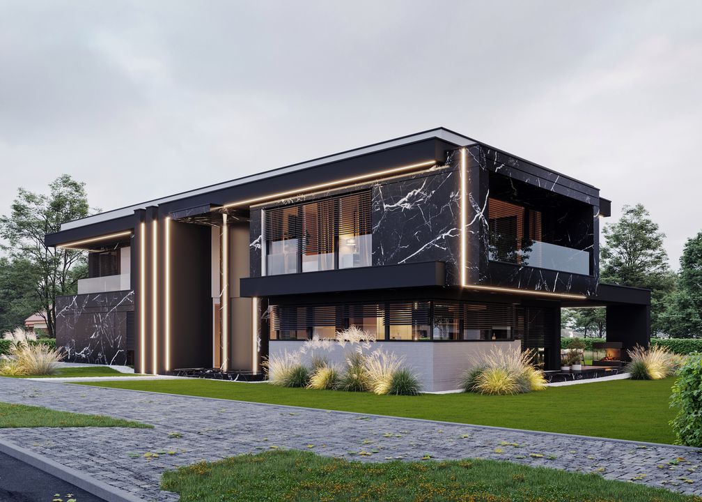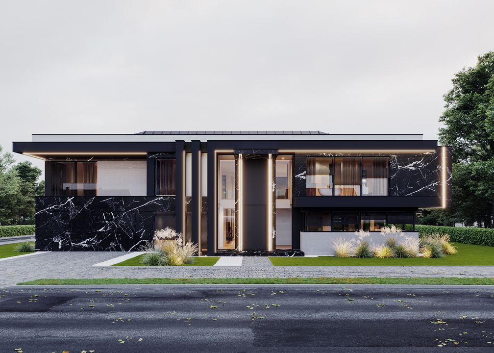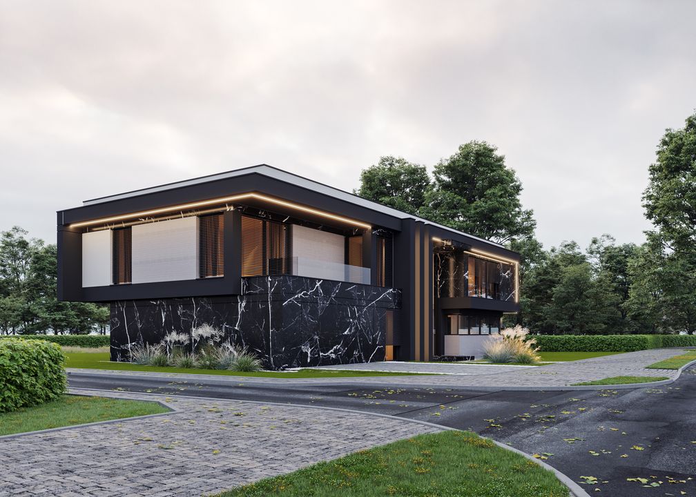 Stopy Fundamentowe żelbetowe monolityczne. Ławy fundamentowe: żelbetowe monolityczne. Ściany fundamentowe: betonowe. Ściany zewnętrzne: pustaki ceramiczne Porotherm Dryfix o grub. 25 cm firmy Wienerberger, styropian Galaxy Fasada o grub. 25 cm firmy Termo Organika. Ściany wewnętrzne: nośne pustaki ceramiczne Porotherm Dryfix o grub. 25 cm i 11,5 cm firmy Wienerberger. Stropy żelbetowe monolityczne. Konstrukcja dachu: więźba dachowa, stropodach żelbetowy. Pokrycie dachu: blacha układana na rąbek stojący firmy Rheinzink. Elewacje tynk zewnętrzny silikonowy, kolor jasnoszary; płyty elewacyjne ze spieków kwarcowych Marble Marquinia Black firmy Laminam lub Marazzi; płyty elewacyjne włóknowo-cementowe Equitone Linea. Okna i drzwi: aluminiowe firmy Aluprof, kolor ciemnoszary. Sposób ogrzewania: podłogowe, powietrzna pompa ciepła, gazowe. Wentylacja: mechaniczna z rekuperacją.