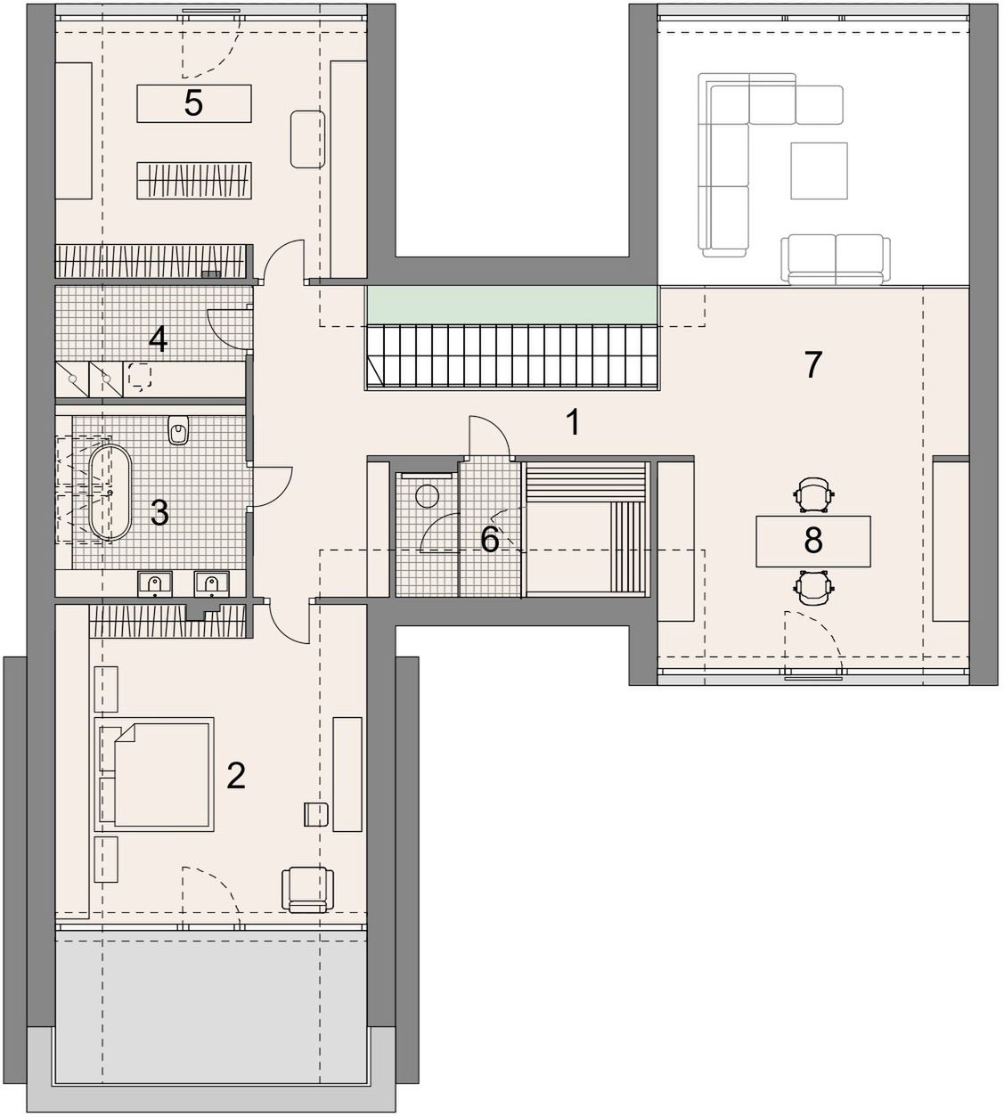 Ławy fundamentowe: żelbetowe. Płyta fundamentowa żelbetowe. Ściany fundamentowe: bloczki betonowe o grub. 25 i 30 cm, styropian XPS o gr.20 cm firmy Termo Organika. Ściany zewnętrzne: pustaki ceramiczne Porotherm Dryfix o grub. 30 cm firmy Wienerberger, styropian Termonium. Fasada o grub. 20 cm firmy Termo Organika /lub wełna mineralna Isover Super-Vent Plus o grub. 15 cm. Ściany wewnętrzne: pustaki ceramiczne Porotherm Dryfix o grub. 11,5 i 25 cm firmy Wienerberger. Stropy żelbetowe, monolityczne. Konstrukcja dachu: drewniana. Pokrycie dachu: dachówka płaska ACTUA 10LT, szara angoba firmy Wienerberger. Elewacje tynk zewn. silikonowy, kolor biały; tynk zewn. strukturalny imitujący strukture kamienia lub betonu, kolor jasnoszary /lub płyty elewacyjne ze spieków kwarcowych Dekton Cosentino Kovik Natural /lub płyty elewacyjne ze spieków kwarcowych Laminam Naturali Pietra Di Savoia Perla; deska kompozytowa elewacyjna, kolor Red Cedar / lub płyty elewacyjne aluminiowe Aluprof strukturalne 3d, kolor imitujący drewno. Okna i drzwi: aluminiowe firmy Aluprof, kolor imitujący drewno. Sposób ogrzewania: podłogowe, powietrzna pompa ciepła. Wentylacja: mechaniczna z rekuperacją.