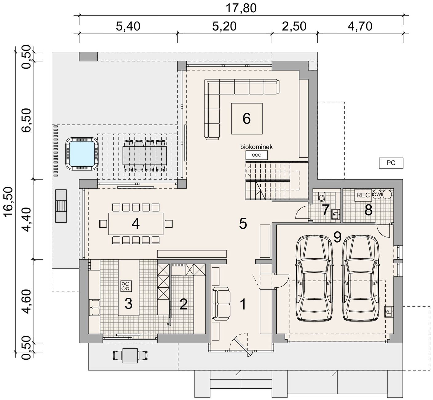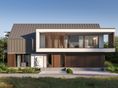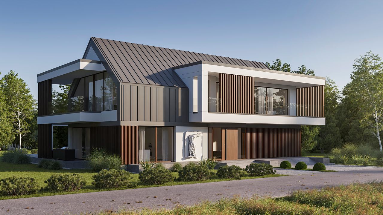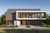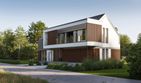 Płyta fundamentowa żelbetowa o gr. 30 cm, styropian Austrotherm EPS 037 DACH/PODŁOGA o gr. 20 cm. Ściany zewnętrzne: pustak ceramiczny Porotherm Dryfix o gr. 30 cm firmy Wienerberger lub słup / ściana żelbetowa monolityczna, styropian Termonium Fasada firmy Termo Organika o gr. 20cm. Ściany wewnętrzne: pustaki ceramiczne Porotherm Dryfix o gr. 25 cm i 11,5 cm firmy Wienerberger. Stropy żelbetowe, monolityczne. Konstrukcja dachu: więźba dachowa; stropodach żelbetowy. Pokrycie dachu: blacha układana na rąbek stojący firmy PREFA kolor antracytowy; membrana BauderTHERMOPLAN T18, żwir. Elewacje tynk zewnętrzny silikonowy, kolory biały; okładzina elewacyjna z paneli z drewna kompozytowego Ultrashield Naturale, kolor Teak; słupki stalowe konstrukcyjne malowane na kolor zblizony do koloru stolarki okiennej. Okna i drzwi: aluminiowe firmy Aluprof, kolor CZEREŚNIA CIEMNA ADEC C106. Sposób ogrzewania: powietrzna pompa ciepła, ogrzewanie podłogowe. Wentylacja: mechaniczna z rekuperacją.