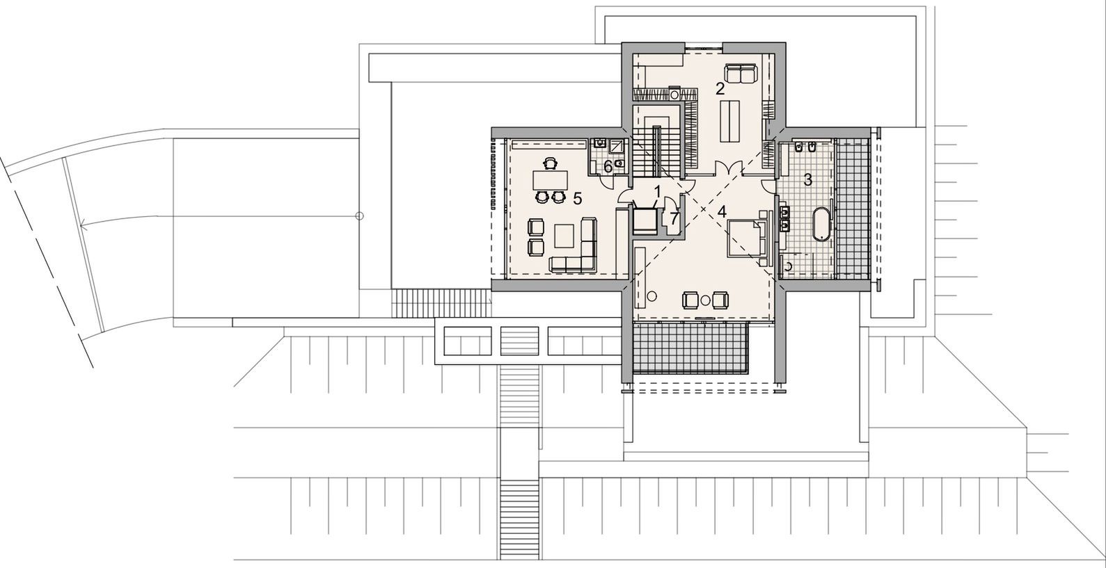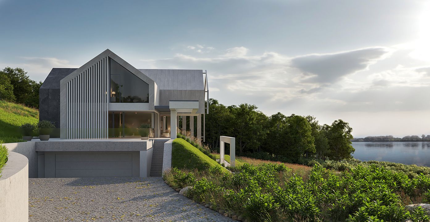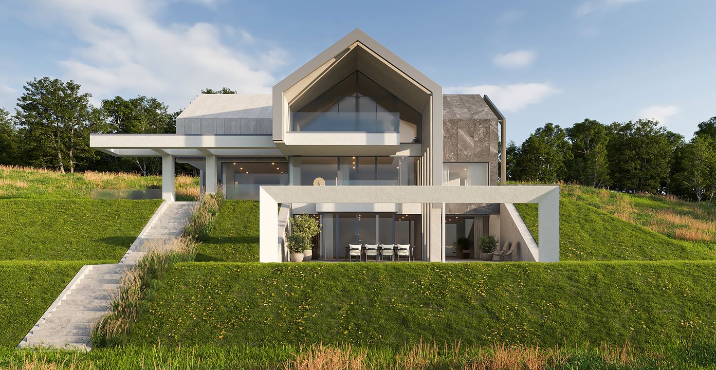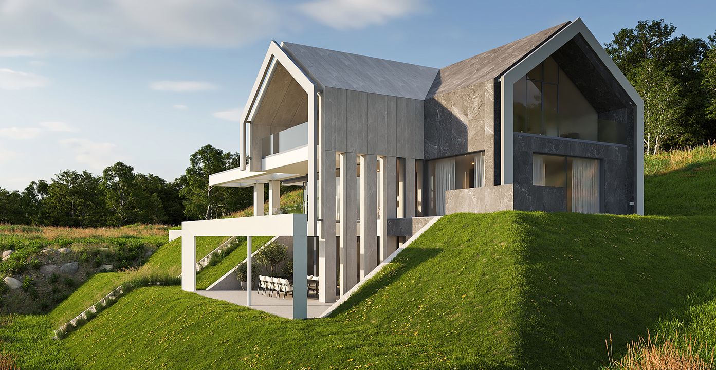 Ściany fundamentowe: żelbetowe o grub. 30 cm, płyty z polistyrenu ekstrudowanego xps firmy Termo Organika gr. 20cm. Ściany zewnętrzne: pustaki ceramiczne porotherm dryfix o grub. 30 cm firmy wienerberger, wełna mineralna isover super-vent (pokryta Welonem szklanym) λ=0,032 w/m*k 20 cm / ruszt systemowy. Ściany wewnętrzne: pustaki ceramiczne Porotherm Dryfix o grub. 25 cm, 18,8 cm i 11,5 cm firmy Wienerberger STROPY: żelbetowe, monolityczne. Konstrukcja dachu: więźba dachowa drewniano-stalowa. Pokrycie dachu: blacha układana na rąbek stojący. Elewacje kolor biały; płyty elewacyjne ze spieków kwarcowych Dekton; kolor jasnoszary: blacha układana na rąbek stojący, w kolorze grafiki płytki: Torano White Tubądzin kolor szary: blacha układana na rąbek stojący w kolorze grafiki płytki: Grand Cave Graphite Tubądzin. Okna i drzwi: aluminiowe firmy Cortizo. Sposób ogrzewania: podłogowe, pompa ciepła. Wentylacja: mechaniczna z rekuperacją.