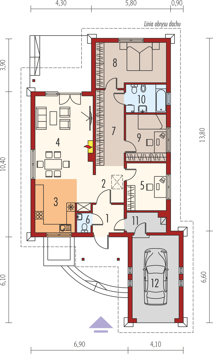 Graficzne opracowanie rzutów poglądowych widocznych na karcie projektu zostało wykonane przez Extradom.pl. Prezentowane przez Extradom.pl wizualizacje wykonane zostały przez autora projektu i należy poczytywać je jedynie za przykład i propozycję wykończenia, wizję architektoniczną autora projektu. Ostateczne wykończenie budynku może nastąpić na wiele sposobów. Szczegółowe rozwiązania zastosowane w oferowanej dokumentacji - w tym również ilość, lokalizacje i wygląd okien, drzwi, kominów - mogą w niewielkim stopniu różnić się od prezentowanej wizualizacji budynku.