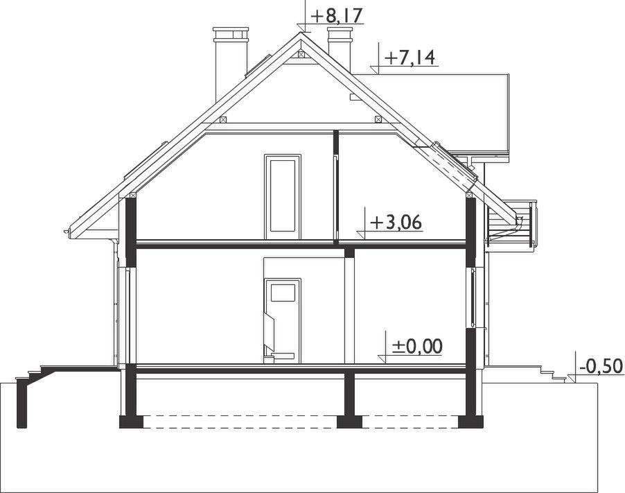 Wersja technologiczna: murowana - beton komórkowy. Strop: żelbetowy monolityczny. Typ schodów: płytowe żelbetowe. Konstrukcja dachu: drewniana krokwiowo-jętkowa. Typ ogrzewania: Kocioł na gaz. Dostępna wersja z pompą ciepła: Tak. Ściany zewnętrzne: 24 cm beton komórkowy. Ściany wewnętrzne: 24 cm beton komórkowy. Ściany wewnętrzne działowe: 12 cm beton komórkowy.