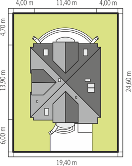 Graficzne opracowanie rzutów poglądowych widocznych na karcie projektu zostało wykonane przez Extradom.pl. Prezentowane przez Extradom.pl wizualizacje wykonane zostały przez autora projektu i należy poczytywać je jedynie za przykład i propozycję wykończenia, wizję architektoniczną autora projektu. Ostateczne wykończenie budynku może nastąpić na wiele sposobów. Szczegółowe rozwiązania zastosowane w oferowanej dokumentacji - w tym również ilość, lokalizacje i wygląd okien, drzwi, kominów - mogą w niewielkim stopniu różnić się od prezentowanej wizualizacji budynku.