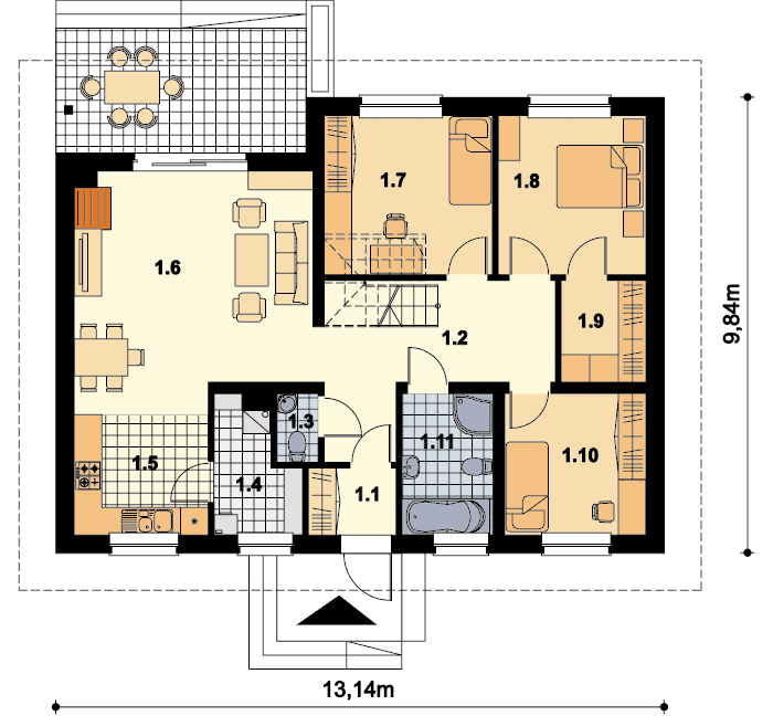 Graficzne opracowanie rzutów poglądowych widocznych na karcie projektu zostało wykonane przez Extradom.pl. Prezentowane przez Extradom.pl wizualizacje wykonane zostały przez autora projektu i należy poczytywać je jedynie za przykład i propozycję wykończenia, wizję architektoniczną autora projektu. Ostateczne wykończenie budynku może nastąpić na wiele sposobów. Szczegółowe rozwiązania zastosowane w oferowanej dokumentacji - w tym również ilość, lokalizacje i wygląd okien, drzwi, kominów - mogą w niewielkim stopniu różnić się od prezentowanej wizualizacji budynku.
