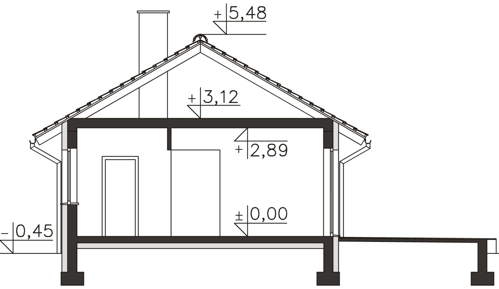 Fundamenty - rozwiązanie o podwyższonej izolacji termicznej. Ściany zewnętrzne - Pustak ceramiczny 25 cm + styropian 15 cm. Strop - drewniany. Dach - wiązary prefabrykowane. Ogrzewanie - c.o. grzejnikowe + c.w.u. - kocioł gazowy. Wentylacja - grawitacyjna.