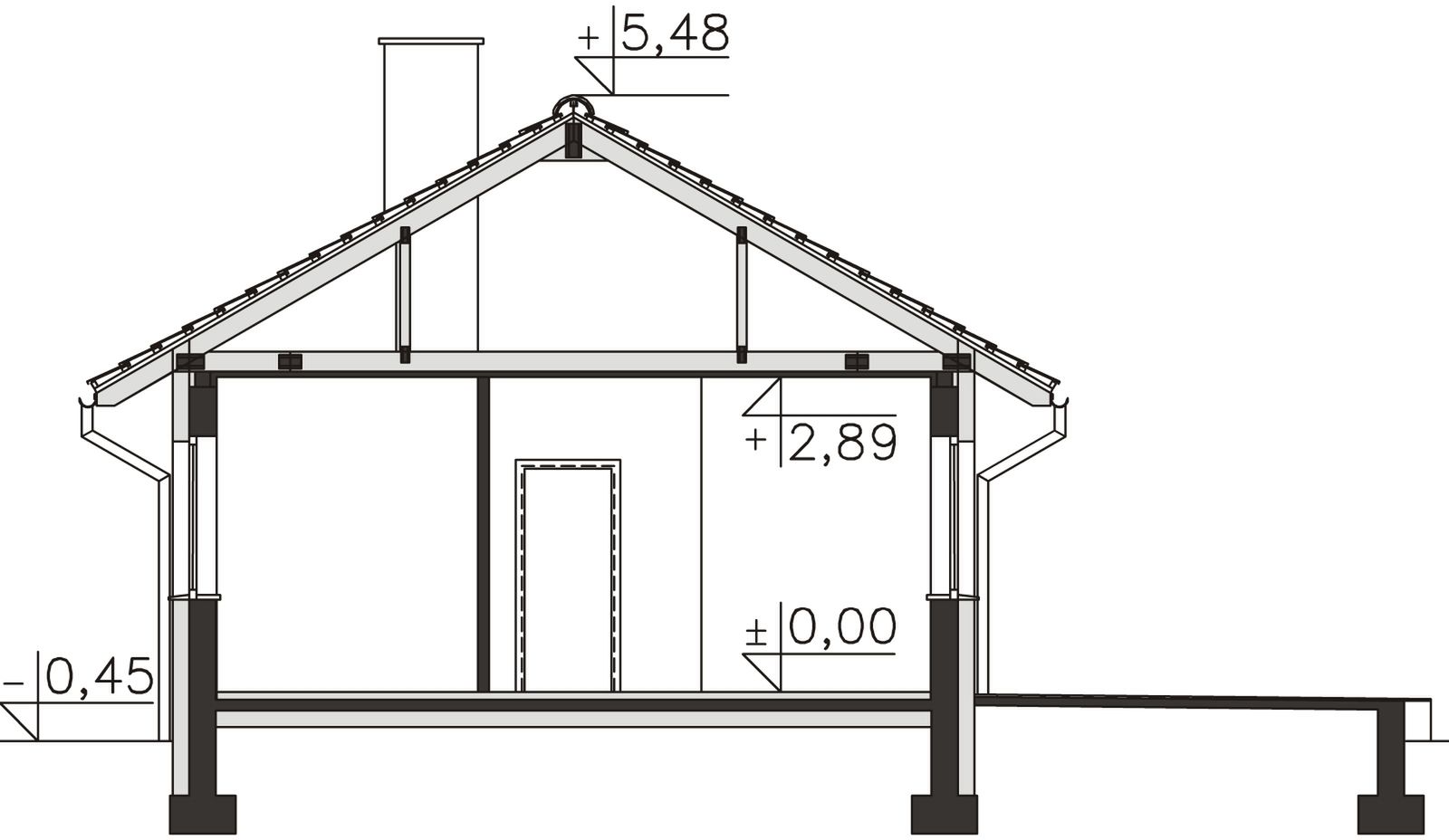 Fundamenty - rozwiązanie o podwyższonej izolacji termicznej. Ściany zewnętrzne - Bloczek silikatowy 24 cm + styropian 20 cm. Dach - wiązary prefabrykowane. Ogrzewanie - c.o. grzejnikowe + c.w.u. - kocioł gazowy. Wentylacja - grawitacyjna.