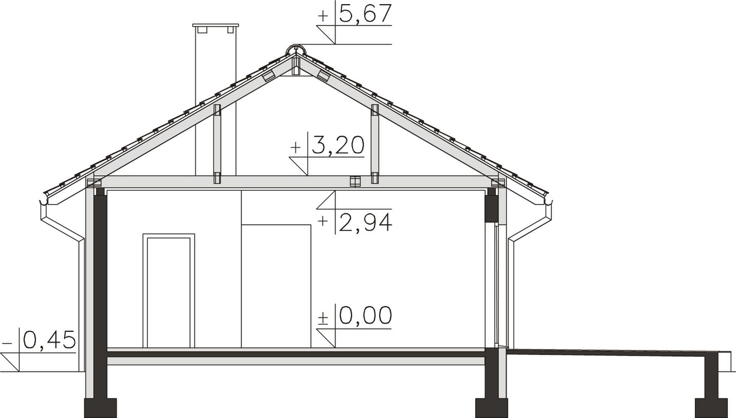 Fundamenty - rozwiązanie o podwyższonej izolacji termicznej. Ściany zewnętrzne - Bloczek silikatowy 24 cm + styropian 15 cm. Dach - wiązary prefabrykowane. Ogrzewanie - c.o. grzejnikowe + c.w.u. - kocioł gazowy. Wentylacja - grawitacyjna.