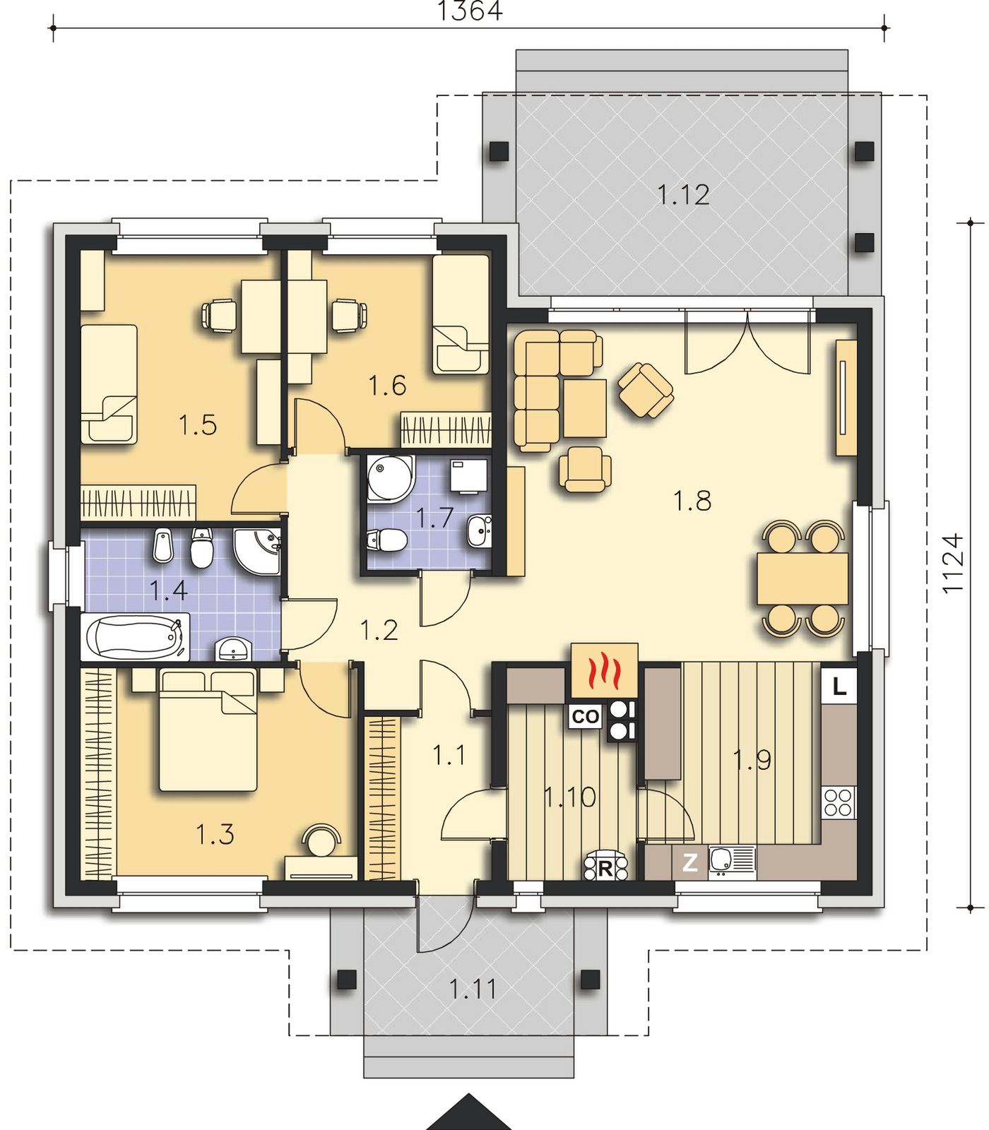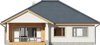 Graficzne opracowanie rzutów poglądowych widocznych na karcie projektu zostało wykonane przez Extradom.pl. Prezentowane przez Extradom.pl wizualizacje wykonane zostały przez autora projektu i należy poczytywać je jedynie za przykład i propozycję wykończenia, wizję architektoniczną autora projektu. Ostateczne wykończenie budynku może nastąpić na wiele sposobów. Szczegółowe rozwiązania zastosowane w oferowanej dokumentacji - w tym również ilość, lokalizacje i wygląd okien, drzwi, kominów - mogą w niewielkim stopniu różnić się od prezentowanej wizualizacji budynku.