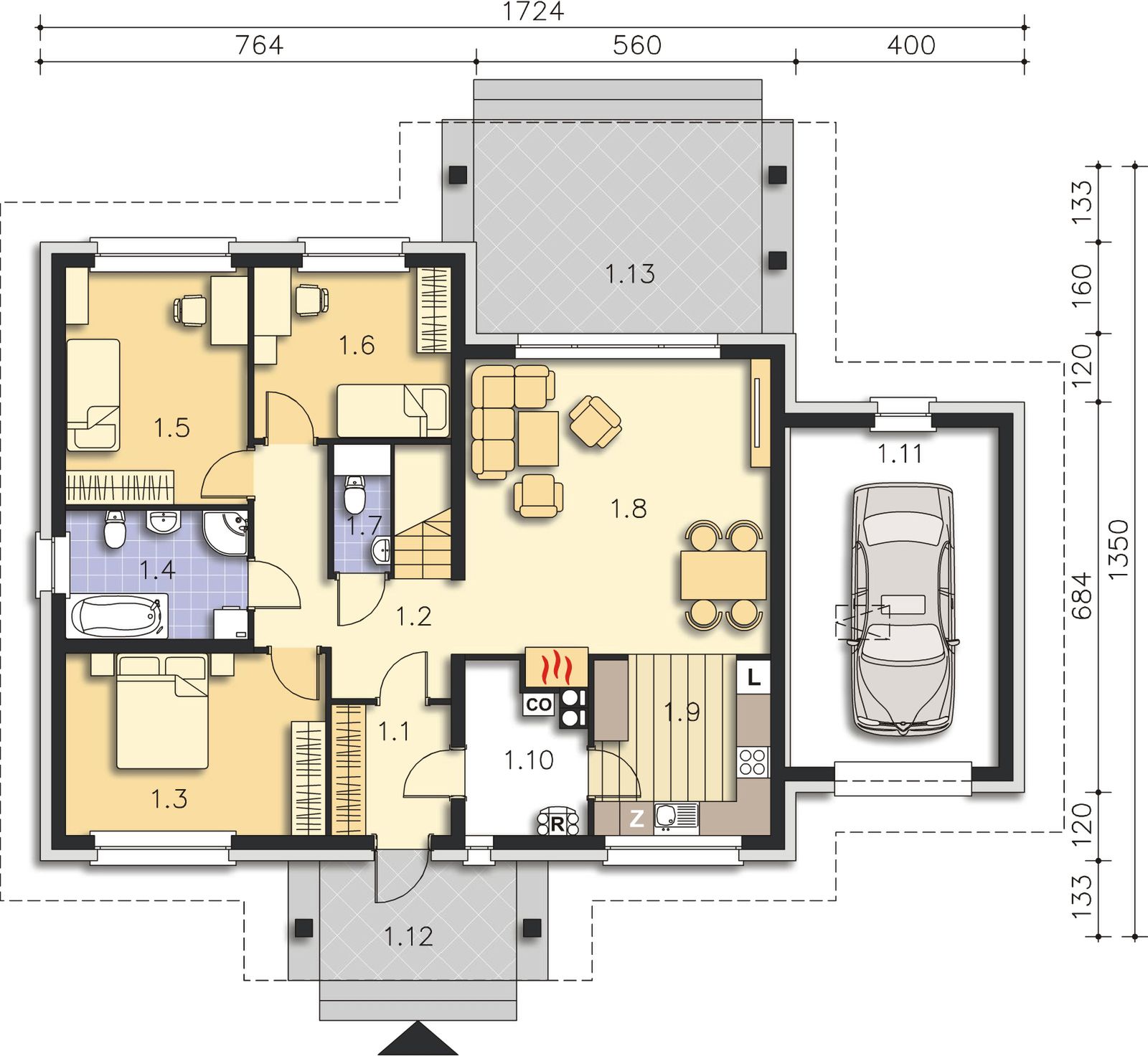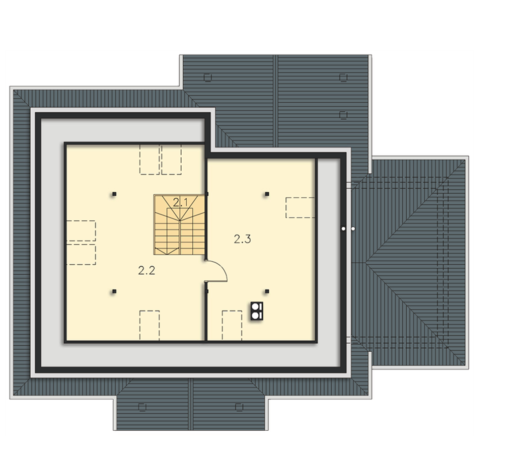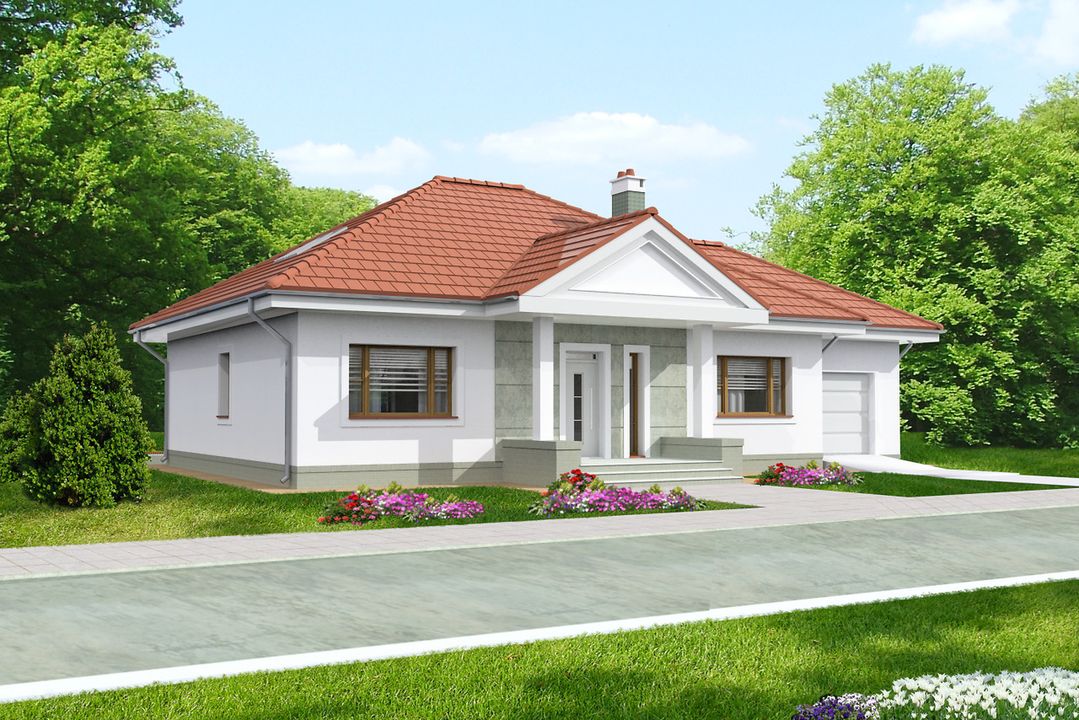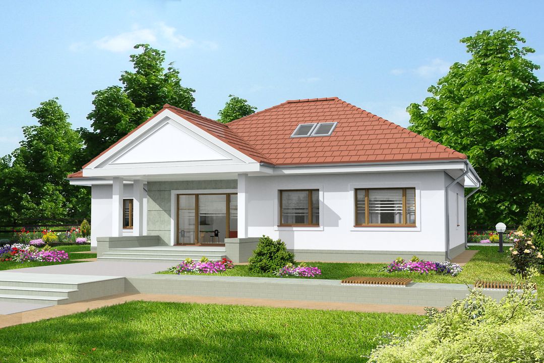Graficzne opracowanie rzutów poglądowych widocznych na karcie projektu zostało wykonane przez Extradom.pl. Prezentowane przez Extradom.pl wizualizacje wykonane zostały przez autora projektu i należy poczytywać je jedynie za przykład i propozycję wykończenia, wizję architektoniczną autora projektu. Ostateczne wykończenie budynku może nastąpić na wiele sposobów. Szczegółowe rozwiązania zastosowane w oferowanej dokumentacji - w tym również ilość, lokalizacje i wygląd okien, drzwi, kominów - mogą w niewielkim stopniu różnić się od prezentowanej wizualizacji budynku.