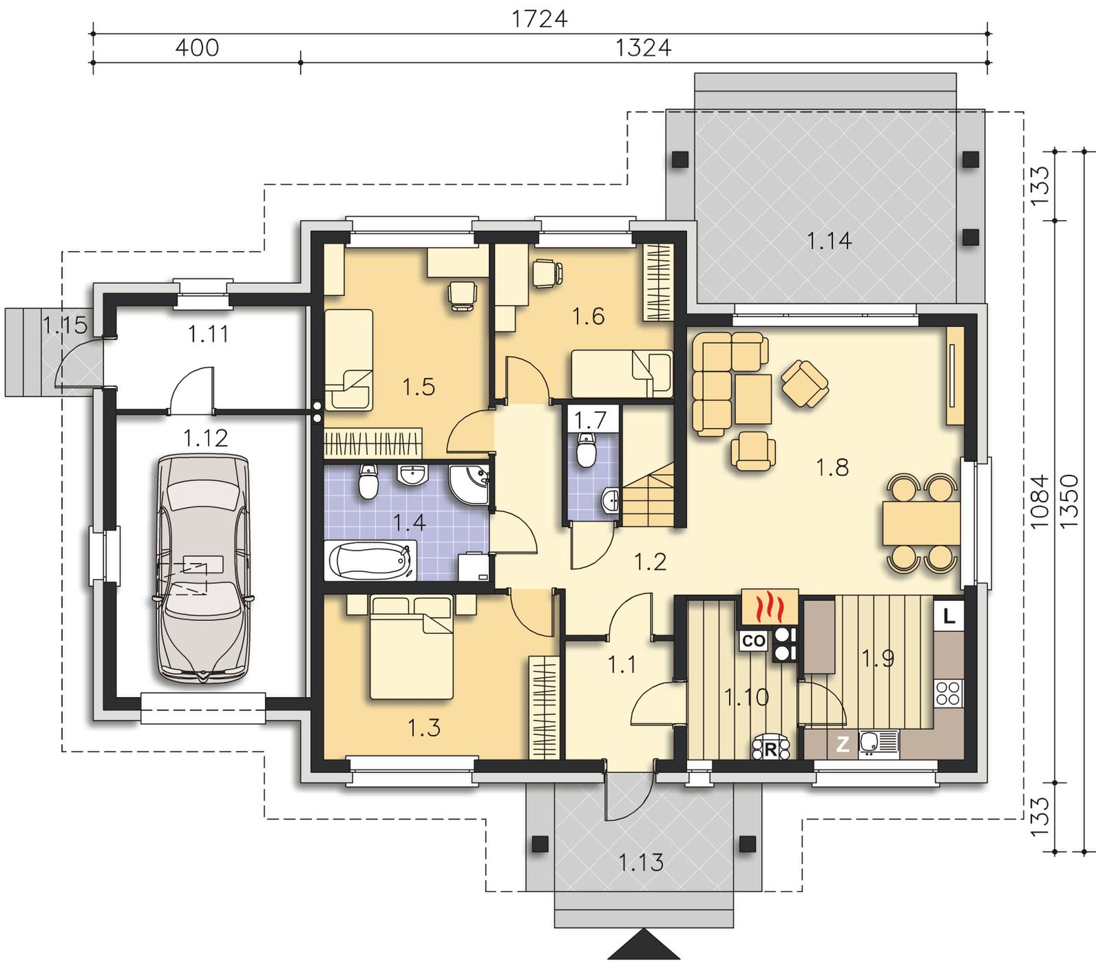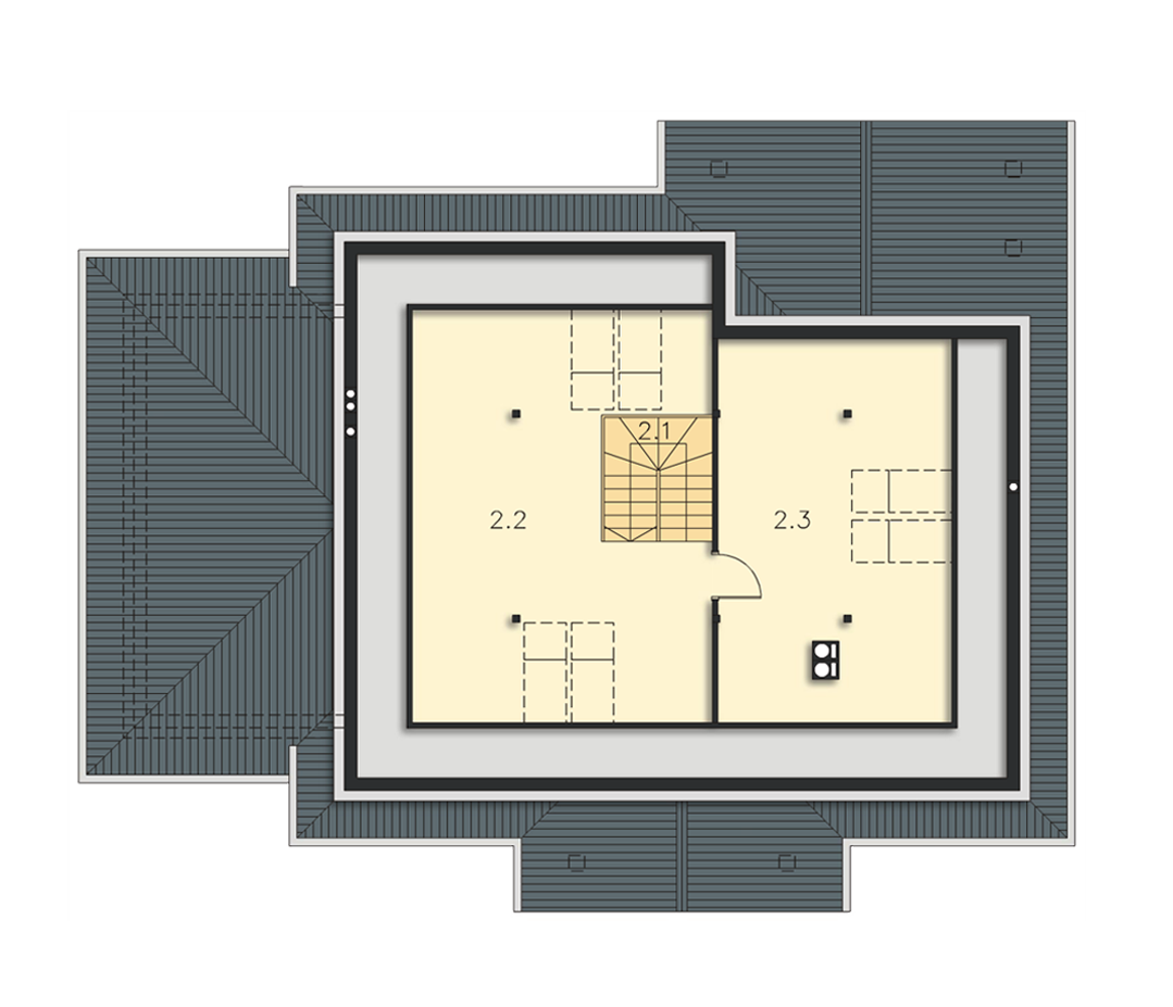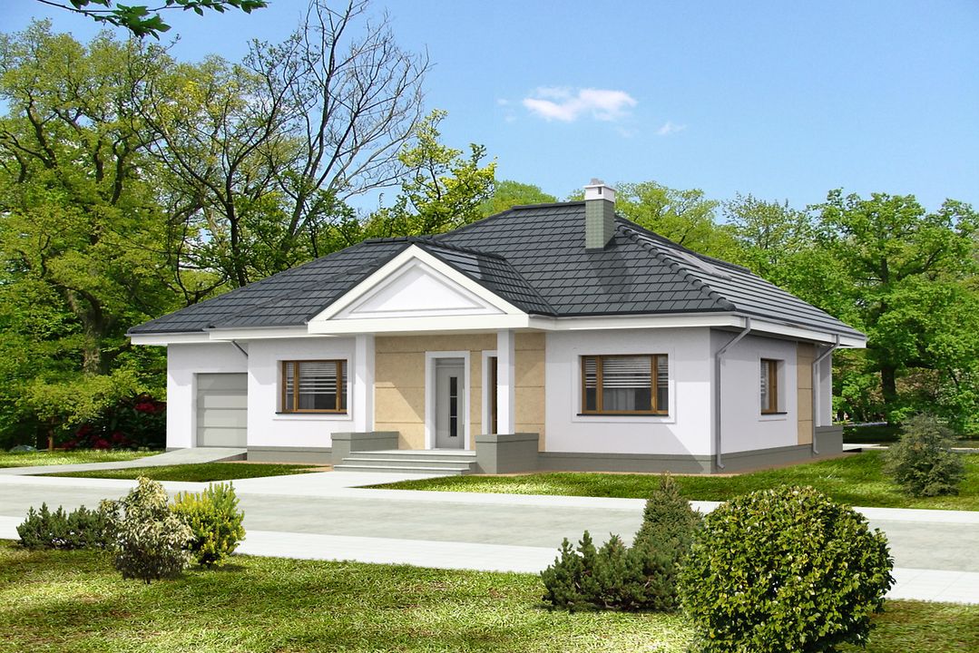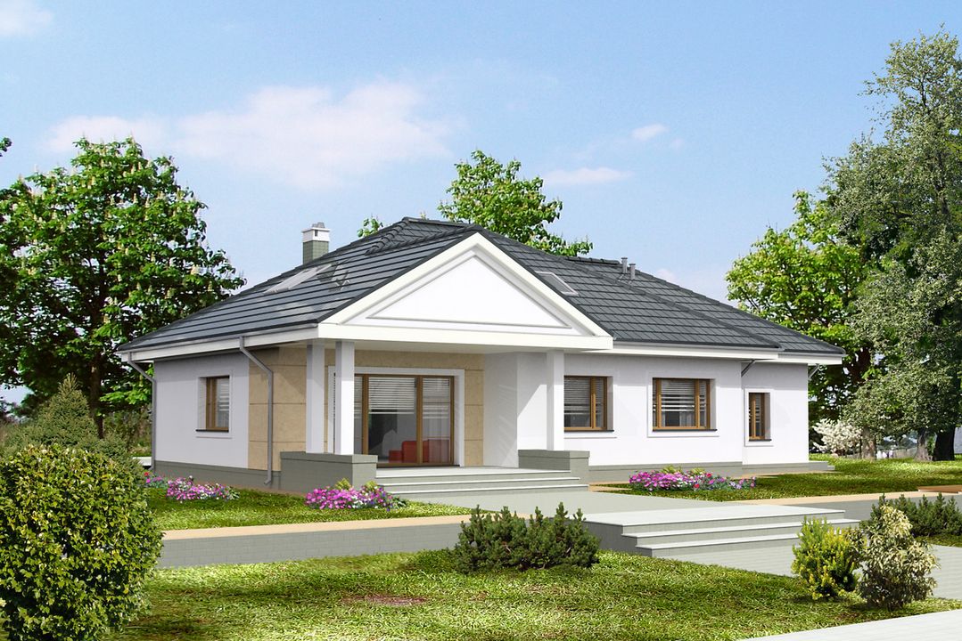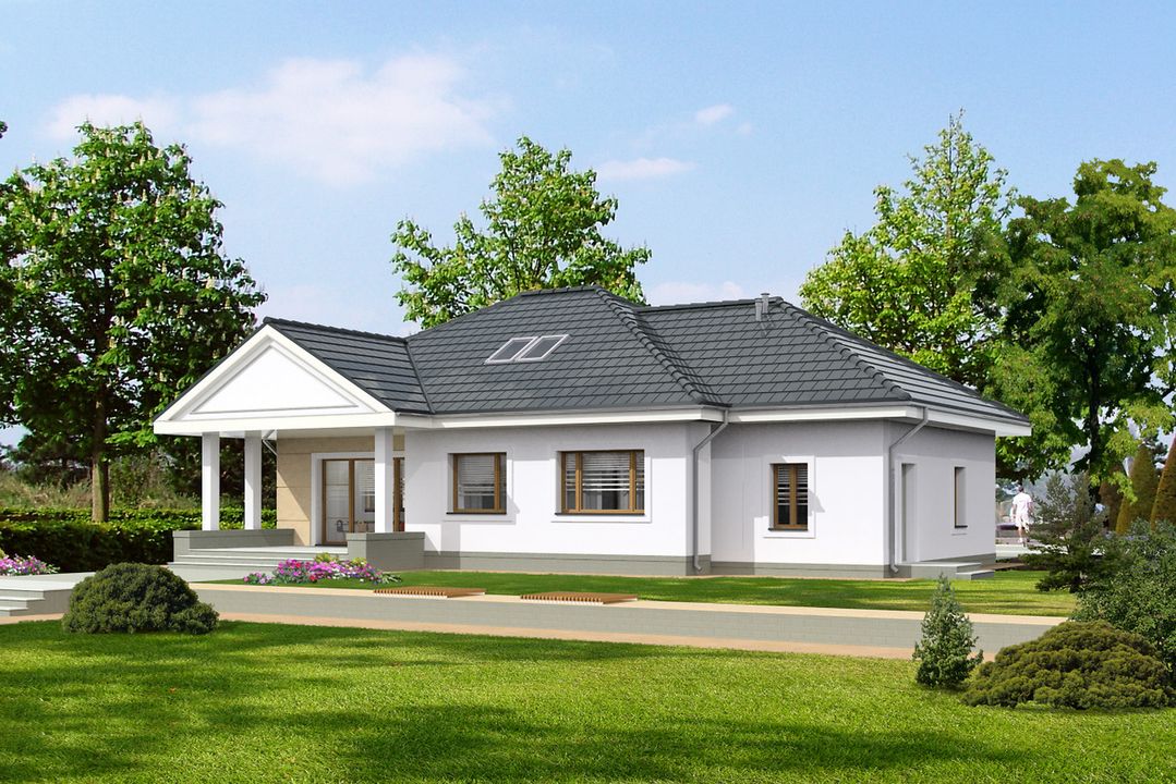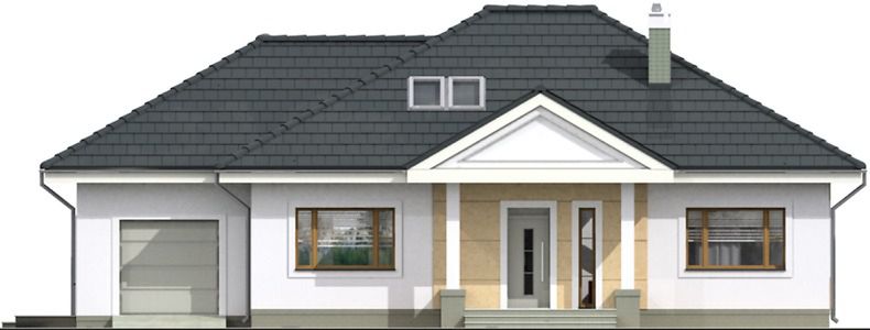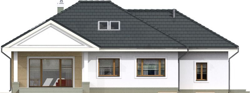 Graficzne opracowanie rzutów poglądowych widocznych na karcie projektu zostało wykonane przez Extradom.pl. Prezentowane przez Extradom.pl wizualizacje wykonane zostały przez autora projektu i należy poczytywać je jedynie za przykład i propozycję wykończenia, wizję architektoniczną autora projektu. Ostateczne wykończenie budynku może nastąpić na wiele sposobów. Szczegółowe rozwiązania zastosowane w oferowanej dokumentacji - w tym również ilość, lokalizacje i wygląd okien, drzwi, kominów - mogą w niewielkim stopniu różnić się od prezentowanej wizualizacji budynku.