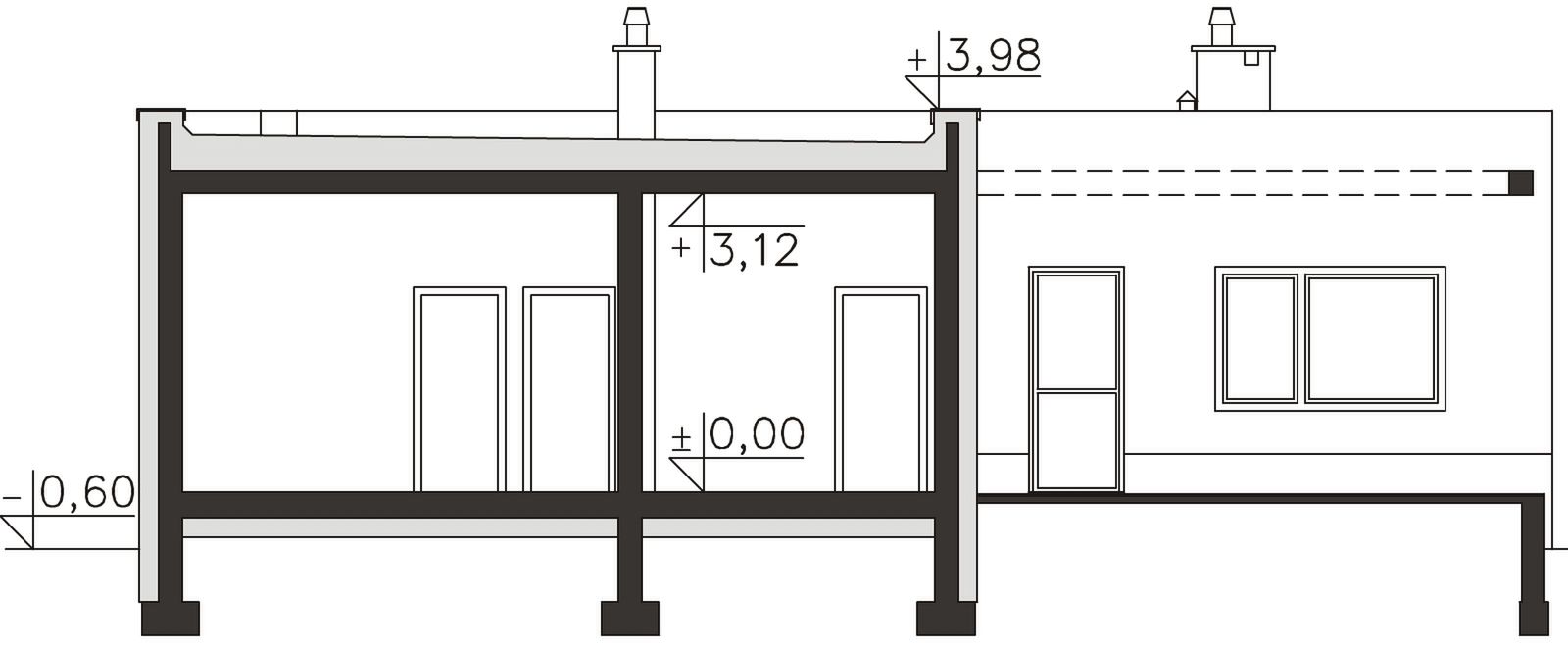 Fundamenty - rozwiązanie o podwyższonej izolacji termicznej. Ściany zewnętrzne - Pustak ceramiczny 25 cm + styropian 20 cm. Dach - stropodach gęstożebrowy. Ogrzewanie - c.o. grzejnikowe + c.w.u. - kocioł gazowy. Wentylacja - grawitacyjna.